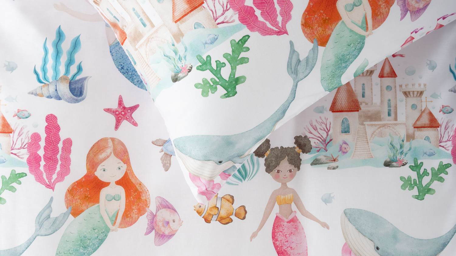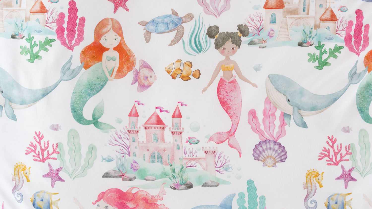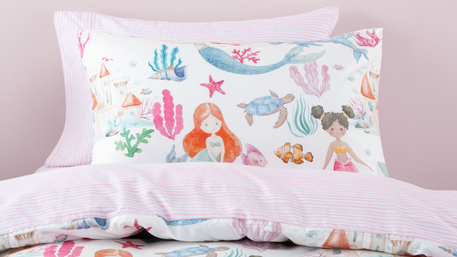 Dive into dreamland with Mermaid Splash! The enchanting underwater scene features a vibrant world of colourful mermaids, friendly dolphins, majestic whales and more. From shimmering seashells to coral castles, this magical seascape is printed on 100% cotton, reversing to a hand-painted stripe print, a dreamy match to the co-ordinating Scribble Stripe Pink sheeting (sold separately).