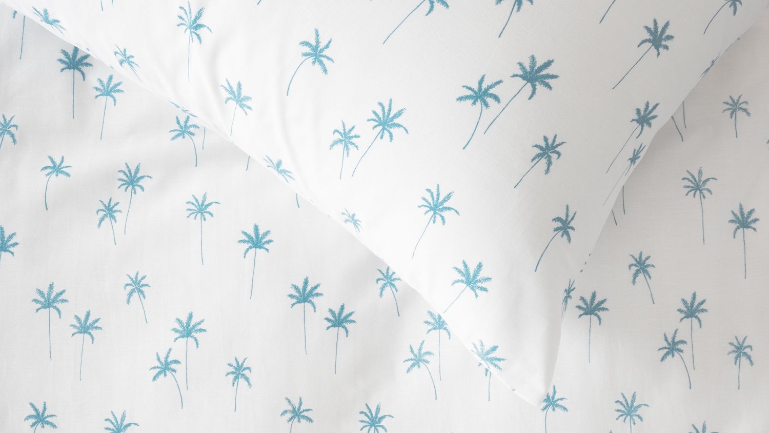Calm your little one with tropical serenity with the Palms Duvet Cover Set. This soothing design features hand-drawn palm trees in tranquil teal on a crisp white background. Printed on 100% cotton, this design is the perfect match to the Squiggles Palms sheeting (sold separately).
