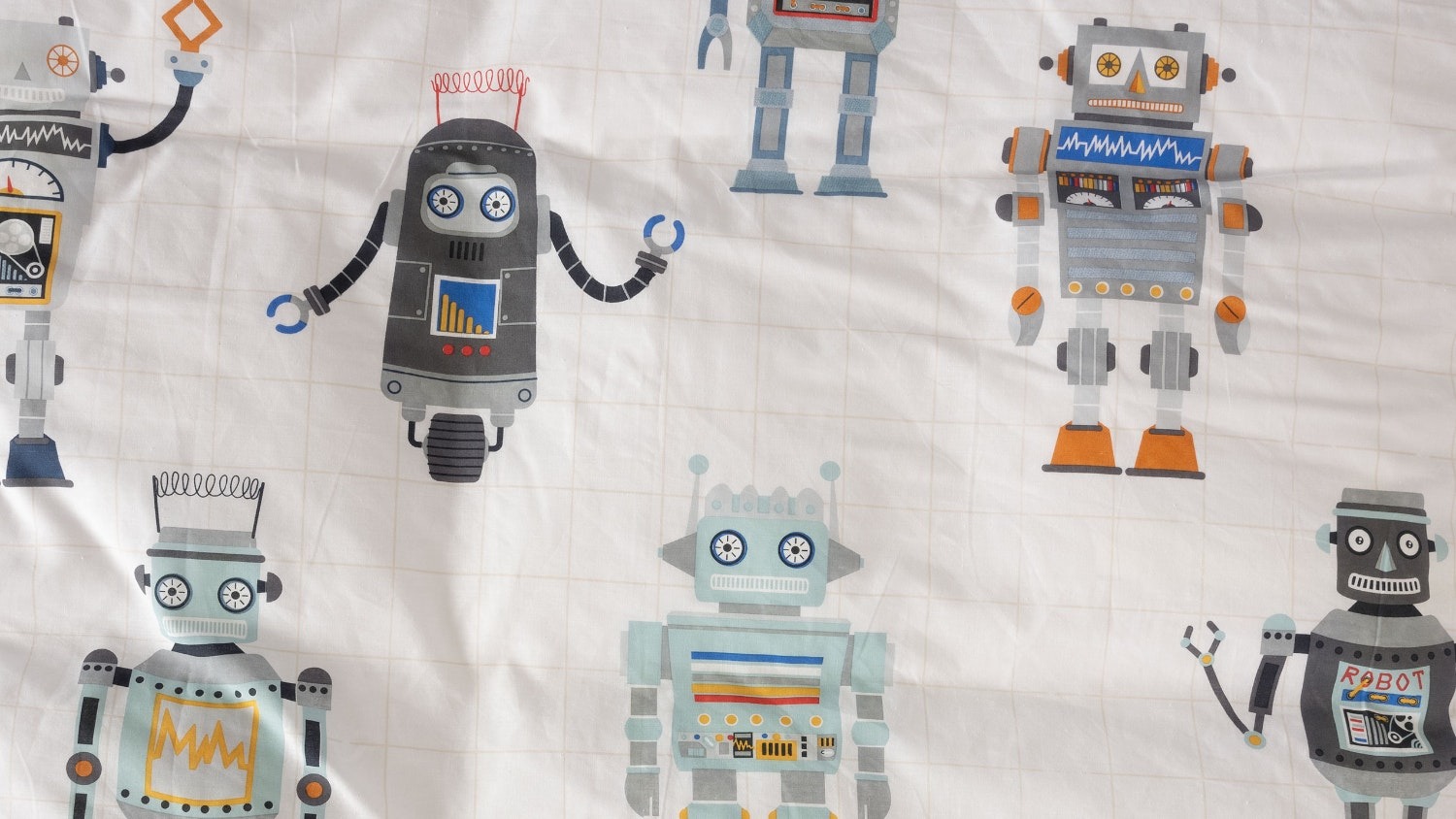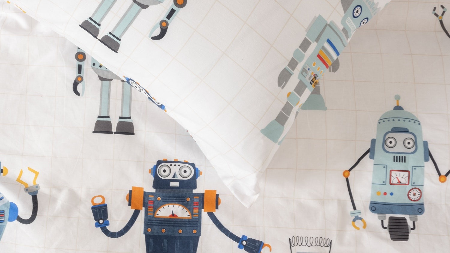Gear up for bedtime adventures with Retro Robots! Your little ones imagination will be sparked by the cool squad of robots exploring across a playful taupe grid on a white base. Printed on 100% cotton, this duvet cover features the same print on both front and reverse sides.