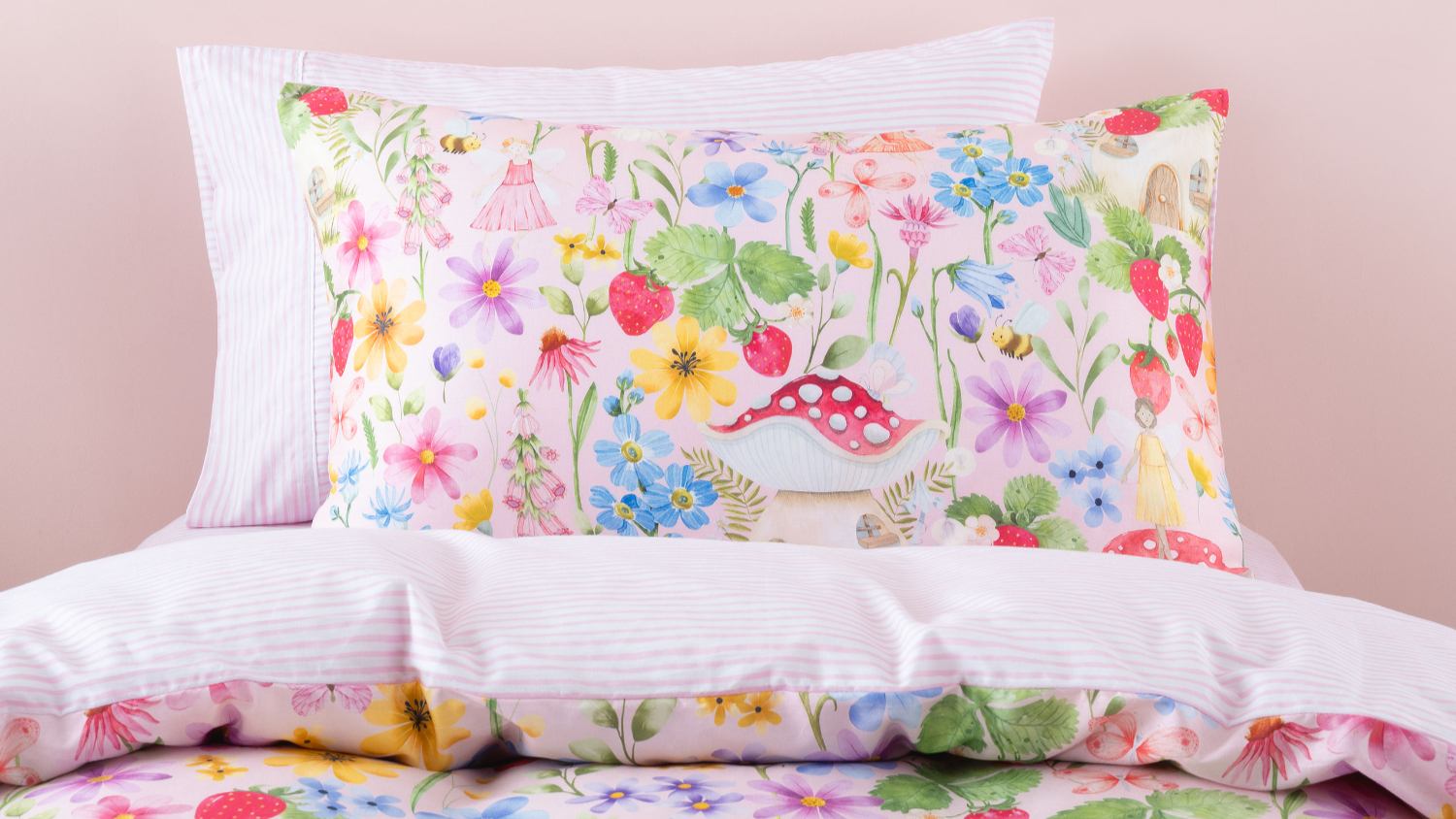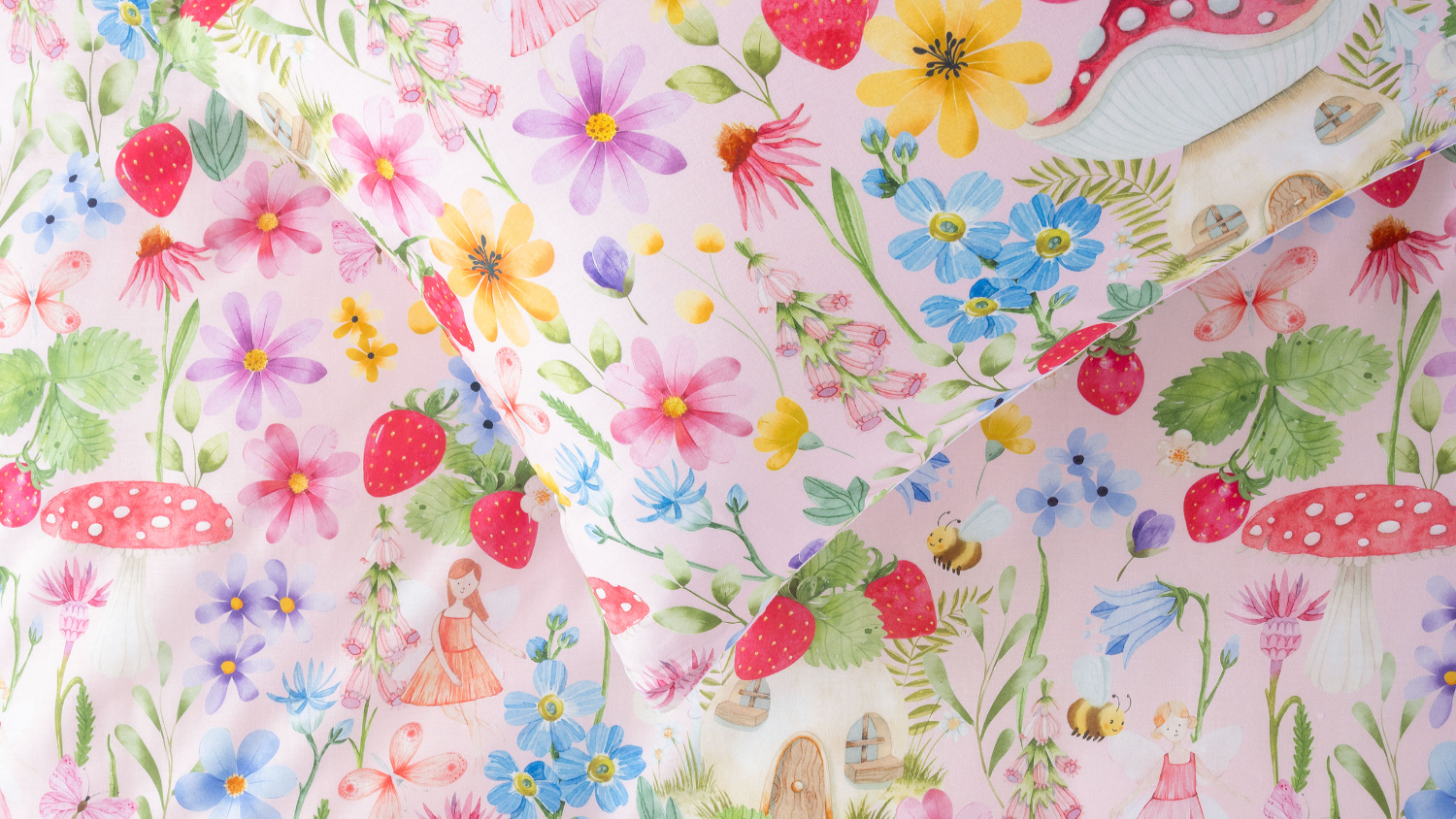 Say hello to bedtime magic! Strawberry Meadow is bursting with fairytale fun, featuring a garden bursting full of cheerful flowers, spotty red toadstools, friendly fluttering fairies and juicy strawberries scattered across a dreamy pink base. This snuggly design is printed on 100% cotton, reversing to a hand-painted stripe print, an enchanting match to the co-ordinating Scribble Stripe Pink sheeting (sold separately).