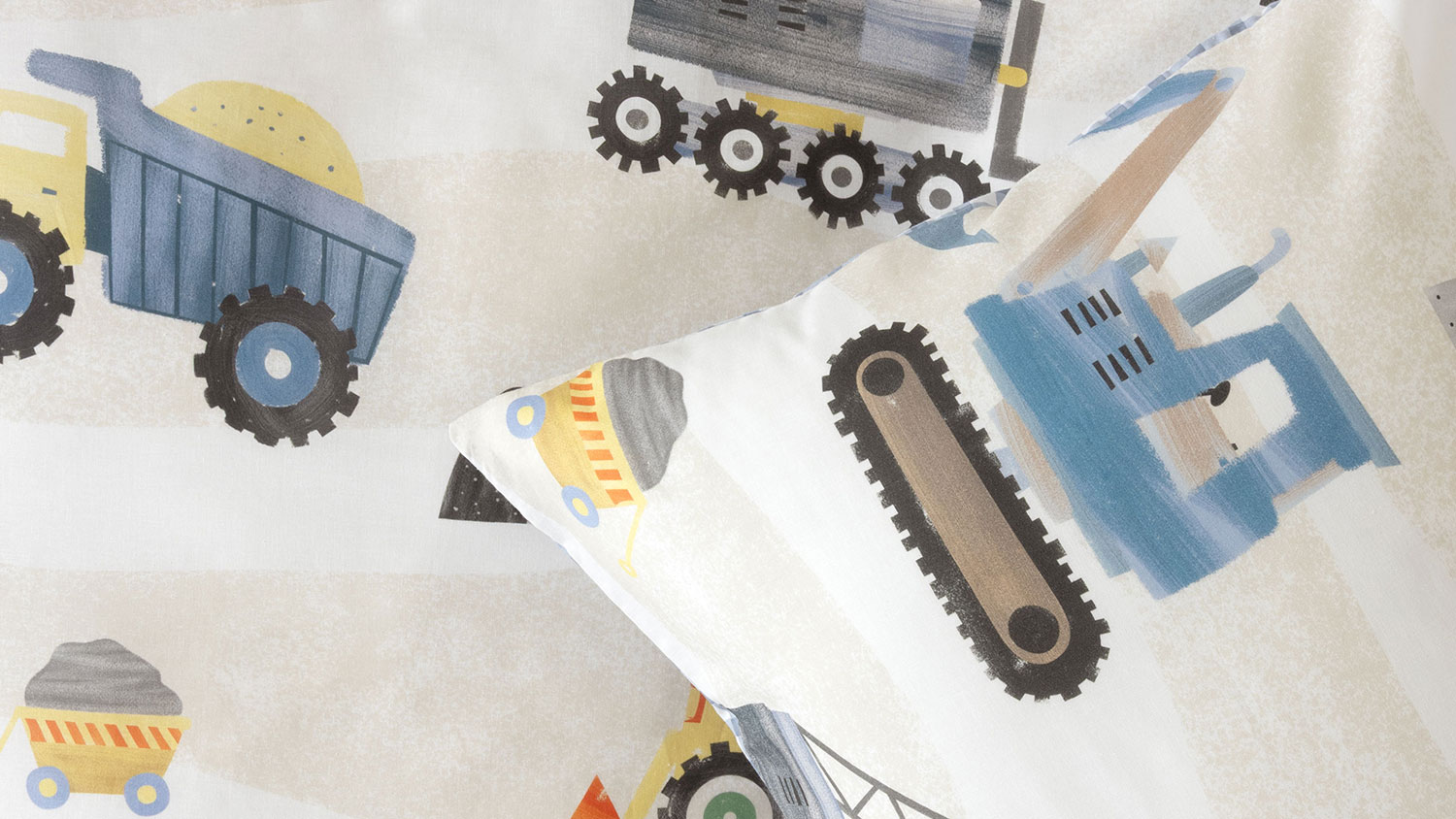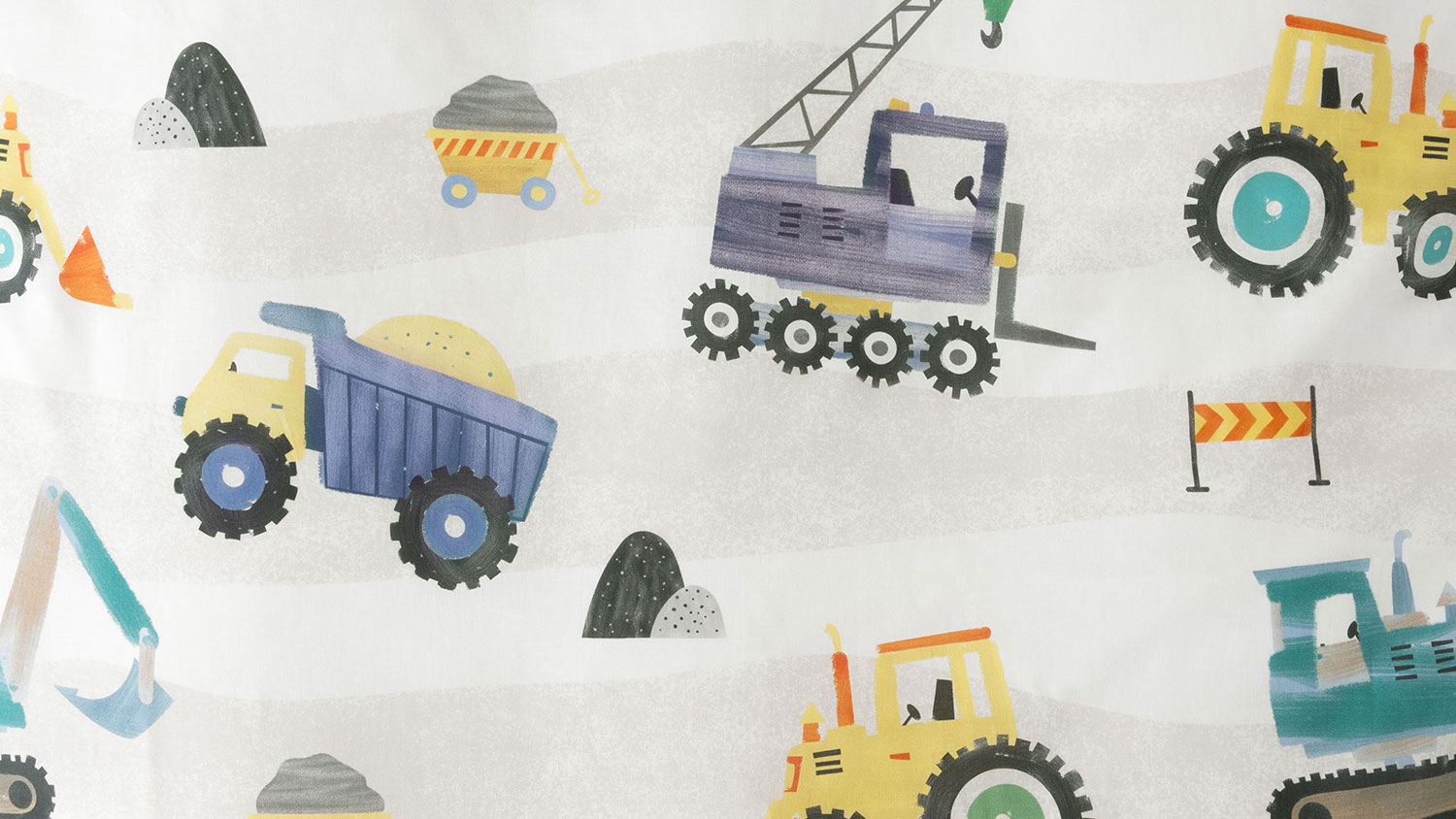 Get ready to dig, build and roll with Tool Time! Perfect for little builders who love construction site action, this cheerful design features diggers, dump trucks, cranes and bulldozers rumbling across a sandy base, bringing the fun of a busy building zone straight to their bedroom. This adventurous design is printed on 100% cotton, reversing to a blue check print, the perfect match to the coordinating Charlie Blue sheeting (sold separately).
