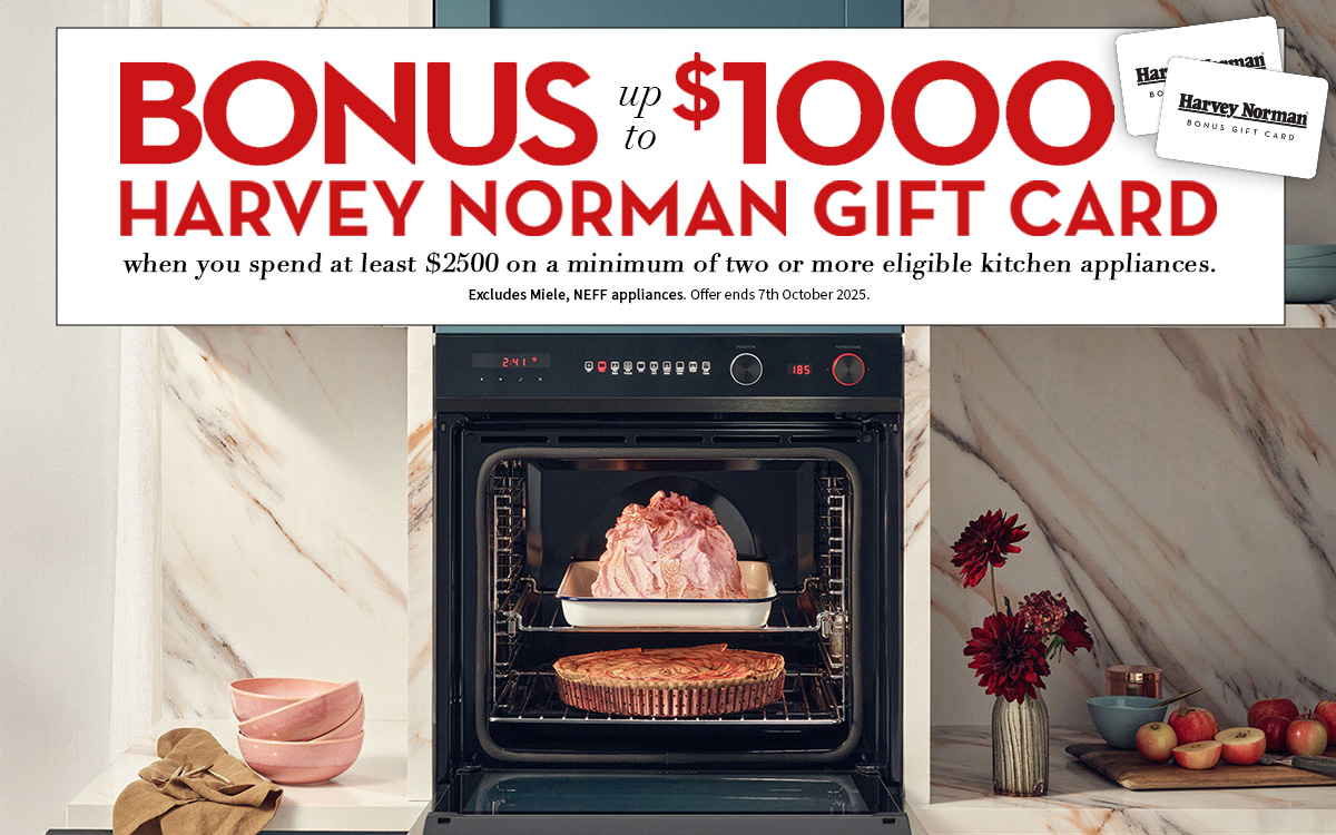 1. The Bonus Offer of a Harvey Norman Gift Card up to the value of $1,000.00, is available for customers spending at least $2,500.00 on two or more Eligible Kitchen Appliances at any Harvey Norman store or online during the Promotional Period (“Bonus Offer Promotion”).
