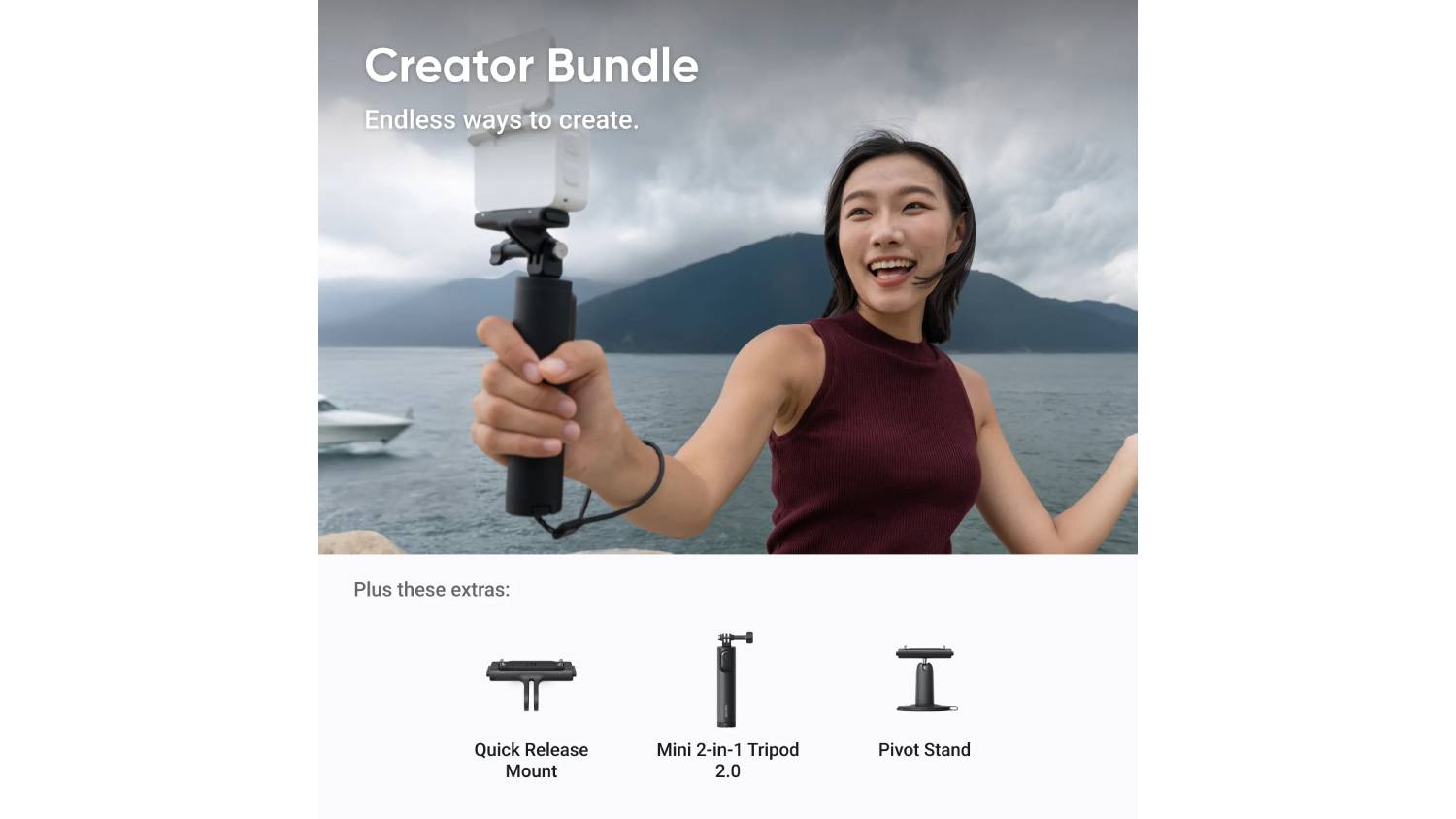 Level up your content with the Insta360 GO Ultra 4K Creator Bundle! This pocket-sized powerhouse captures crisp 4K video and stunning 50MP photos with its advanced imaging technology. Its 360 Horizon Lock and FlowState Stabilization keep every shot smooth and steady, while AI-Powered Editing makes creating share-ready clips effortless. It also comes with a Mini Tripod, Quick Release Mount, and Pivot Stand, giving you flexible setup options.