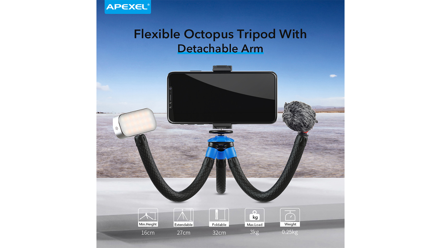 Level up your mobile content creation with the Apexel Portable Detachable Octopus Tripod! This mobile photography accessory is designed with a 360° rotating cradle head and flexible legs to capture stunning shots from any angle. Its legs are easily detachable transforming it into a compact tabletop tripod, while each bottom legs integrate a 1/4-inch screw for mounting various equipment. In addition, its lightweight and foldable build makes it easy to slip into bags and bring wherever your adventure takes you.