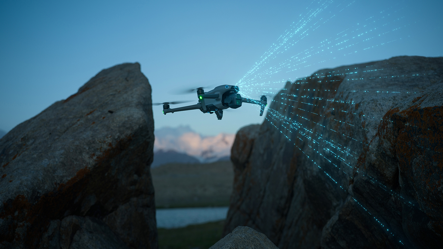2 Measured by DJI Air 3S flying forward at a constant speed of 32.4 kph in a windless environment at sea level, with Obstacle Avoidance Action set to Brake, in photo mode, and from 100% battery level until 0%.