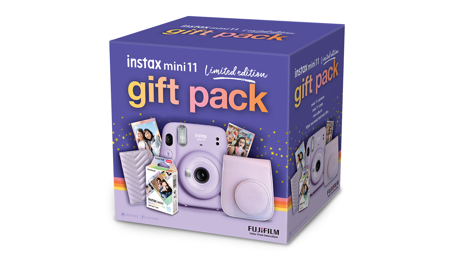 Show your love for yourself, family, or friends and treat them with this Instax Mini 11 Lilac Purple Gift Pack. This pack comes with a set of Instax products that you will love, such as a Mini 11 Camera, Mini 11 Case, Mini album, and 10-pack Mini films.