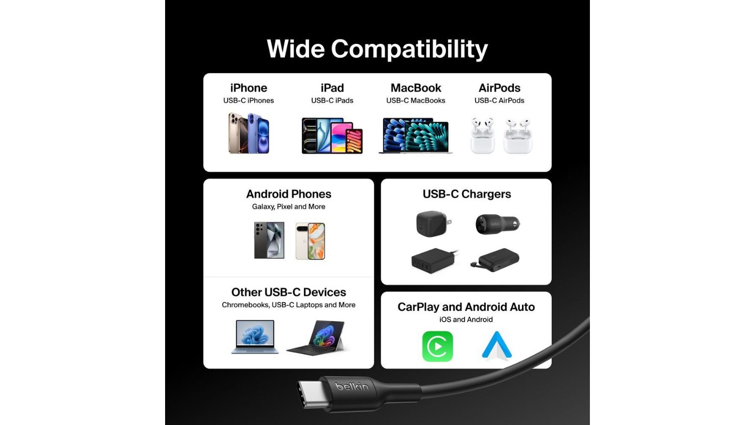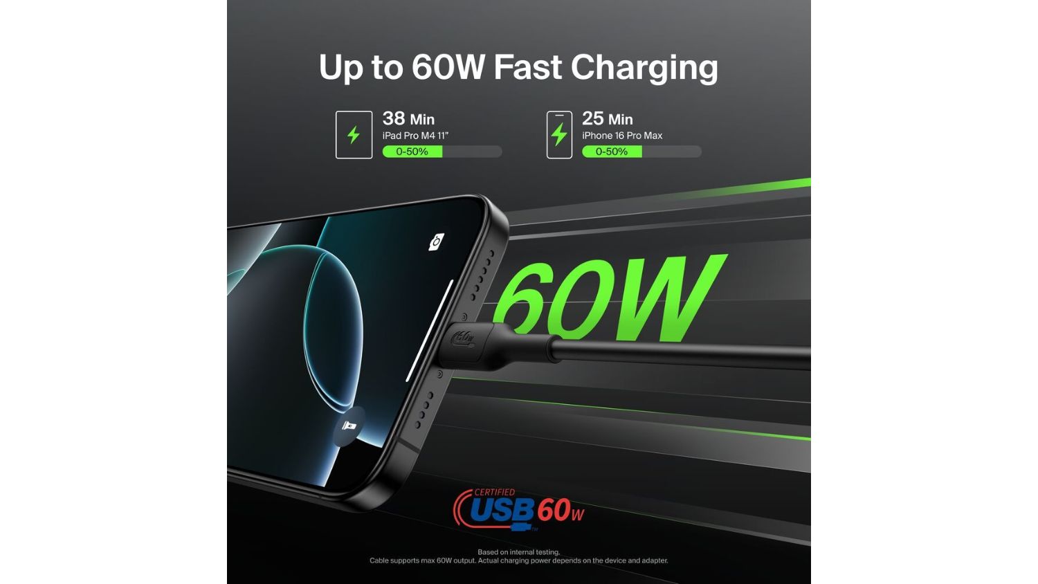 *Based on internal testing. Cable supports a max 60W output. Actual charging power depends on the device and adapter.
