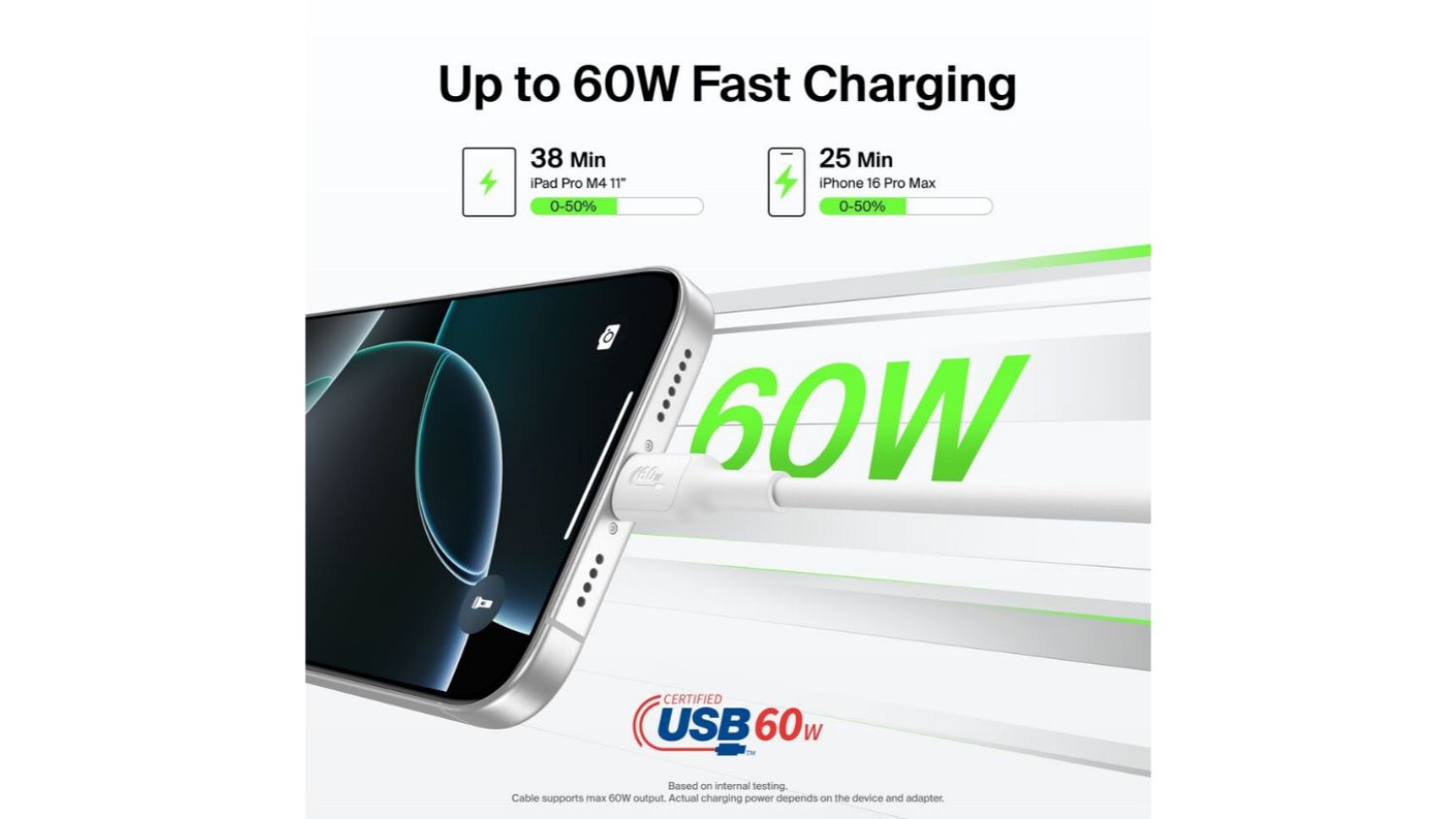 *Based on internal testing. Cable supports a max 60W output. Actual charging power depends on the device and adapter.