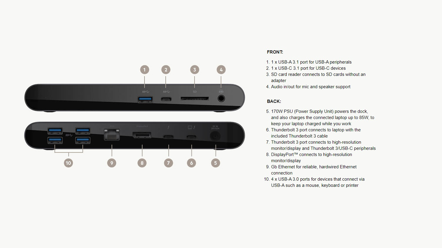 Expand the capabilities of your device with the Belkin Thunderbolt 3 Dock Pro Docking Station. This docking station features 13 different ports for connecting your laptop or PC to external peripherals and devices. It can also provide up to 85W of power upstream, allowing you to quickly replenish your computer's battery when it is running low.