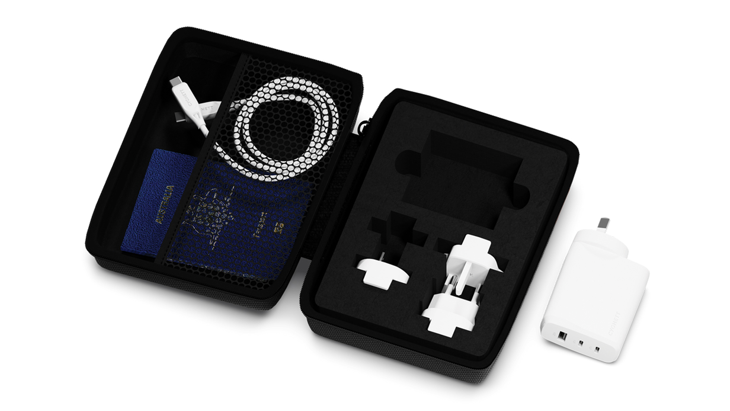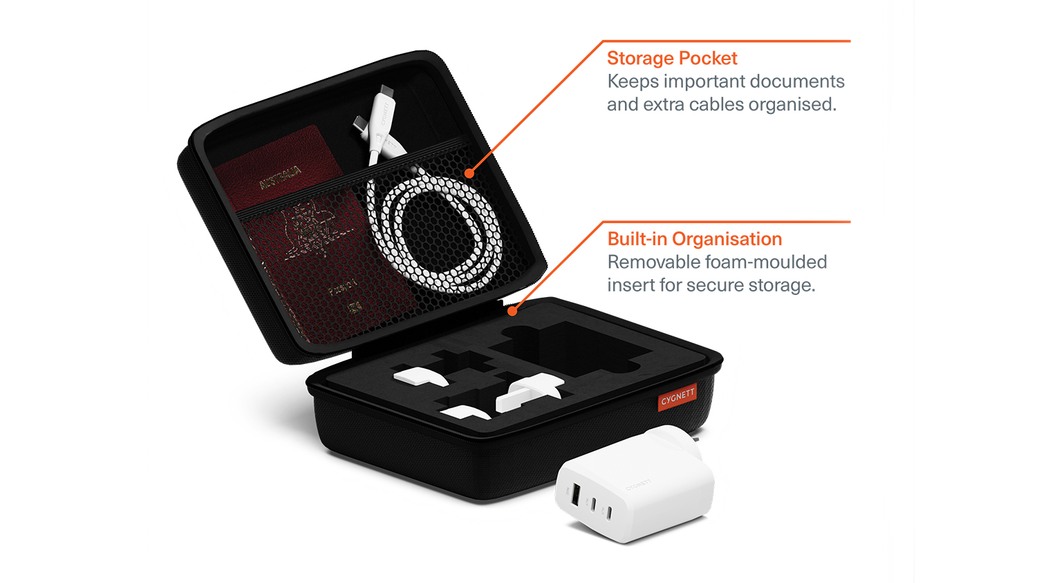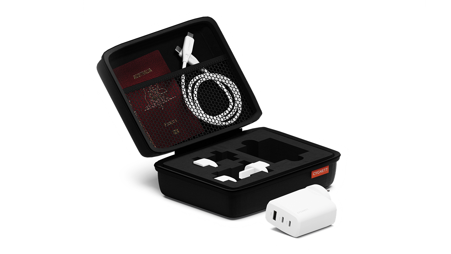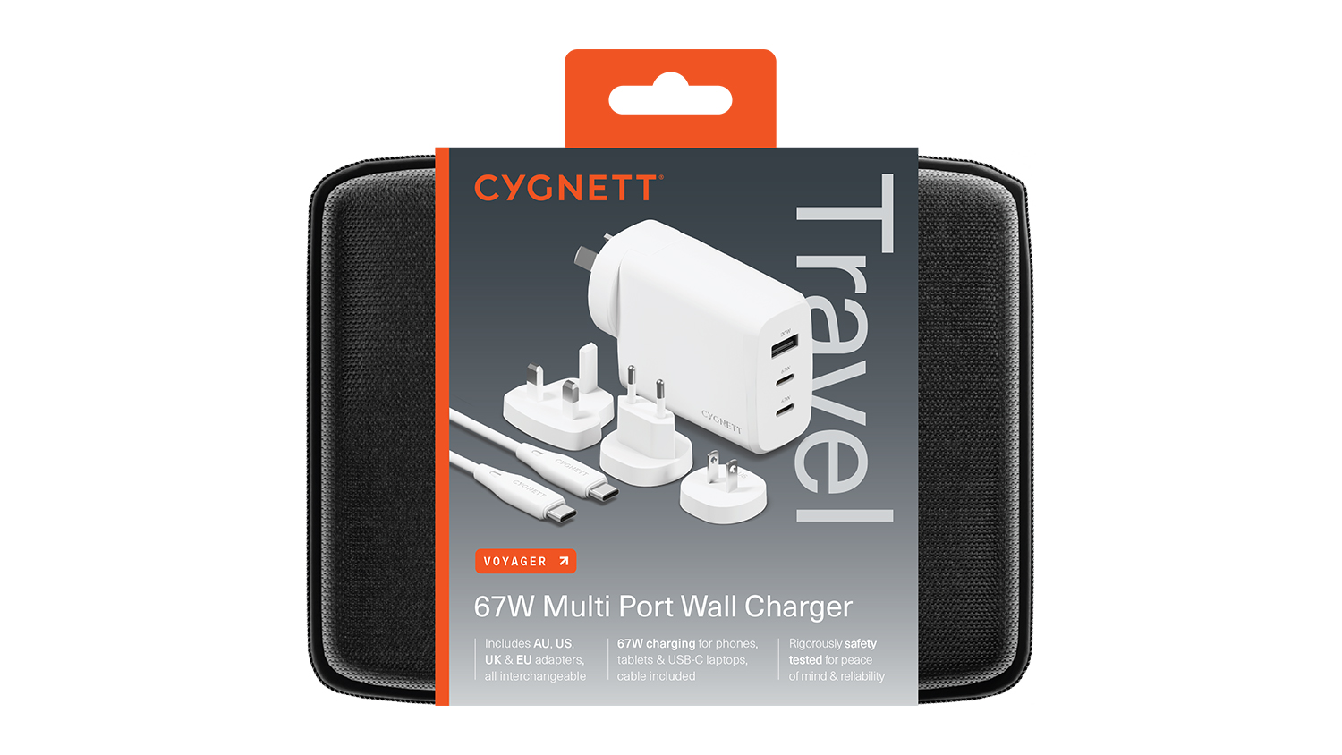 Experience the perfect blend of efficiency and safety with the Cygnett PowerMaxx 67W GaN 3 Port Travel Wall Charger! Featuring an innovative two-step interlocking mechanism and triple device charging capability, this unit lets you power up multiple devices simultaneously. Plus, the included travel case, 1m cable, and three adapters make it the ideal charger for your modern, on-the-go lifestyle.