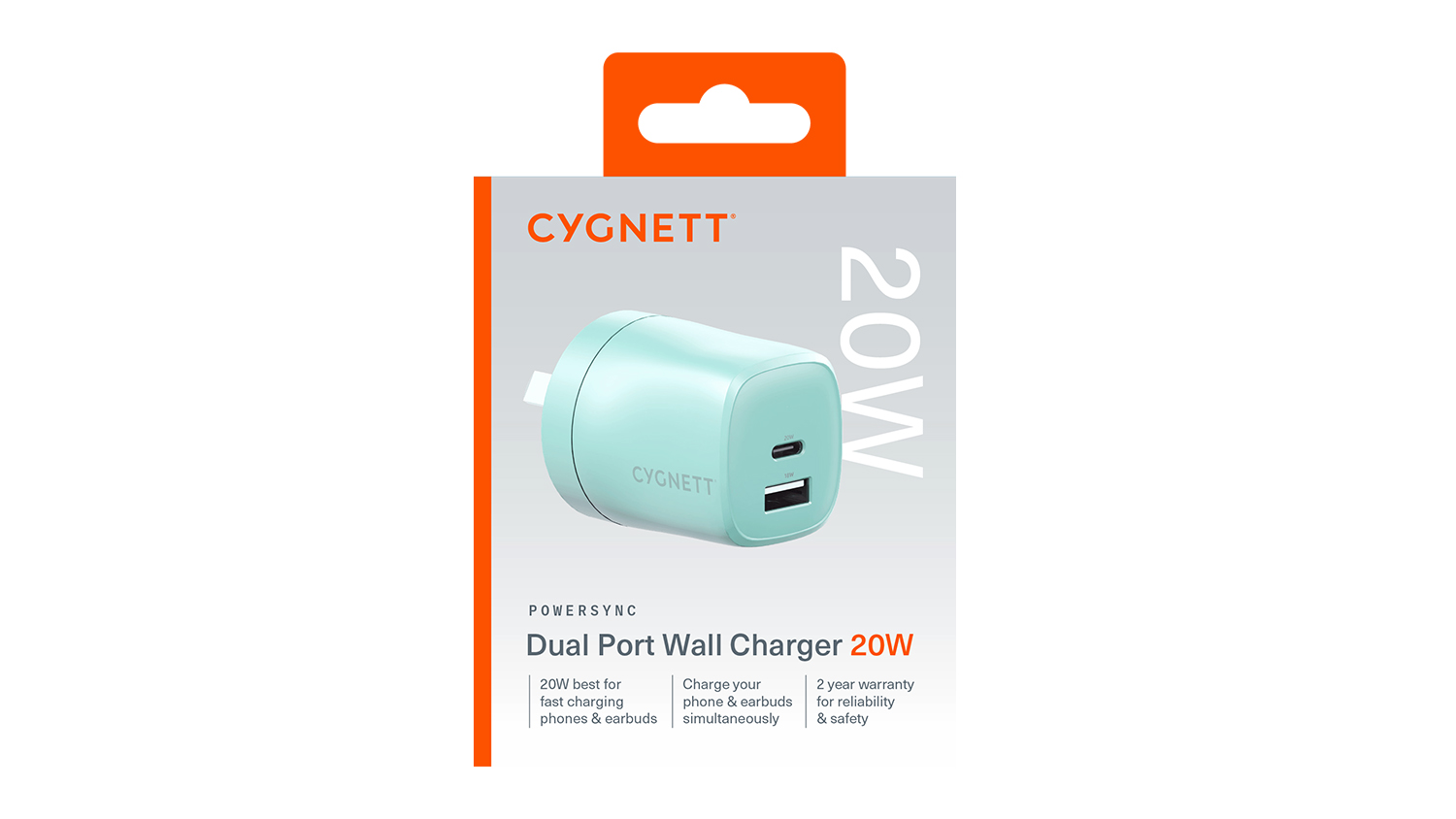 Say goodbye to fighting over outlets with the Cygnett PowerSync 20W Dual Port Wall Charger. Featuring USB-C and USB-A ports, this accessory keeps two devices powered simultaneously with up to 20W of total output. Compact and colourful, it’s built for convenience and style.