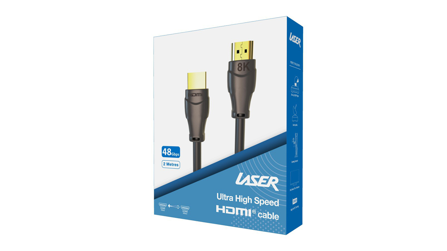 Elevate your home theatre and gaming experience with the Laser 8K Gold HDMI 2.1 Cable! A must-have for your entertainment setups, this reliable cable delivers superior 8K and 4K resolution output for an immersive viewing experience. It is also engineered with gold-plated connectors to deliver lossless signal transmission and enhanced durability. Plus, its 2-metre cable length offers ample flexibility for connecting your devices.