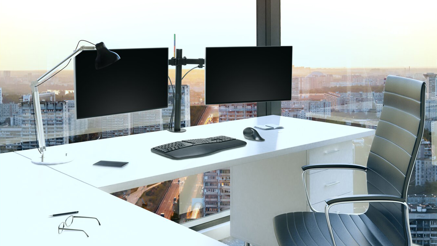 Introducing the Kensington Smartfit Ergo Dual Extended Monitor Arm, a space-efficient solution to add to your desk. This Smartfit Ergo Dual provides a wide adjustment range, making it easier to swivel, rotate, and tilt your monitors to an angle you are comfortable with. It also features cable management and requires minimal desk space thanks to its C-clamp and grommet fastener. With this device, positioning your monitor at the perfect angle has never been easier!
