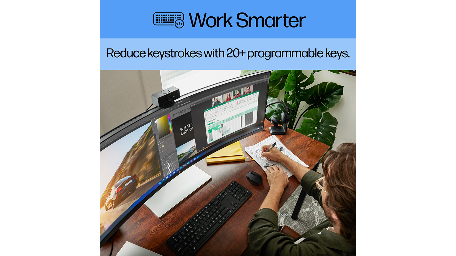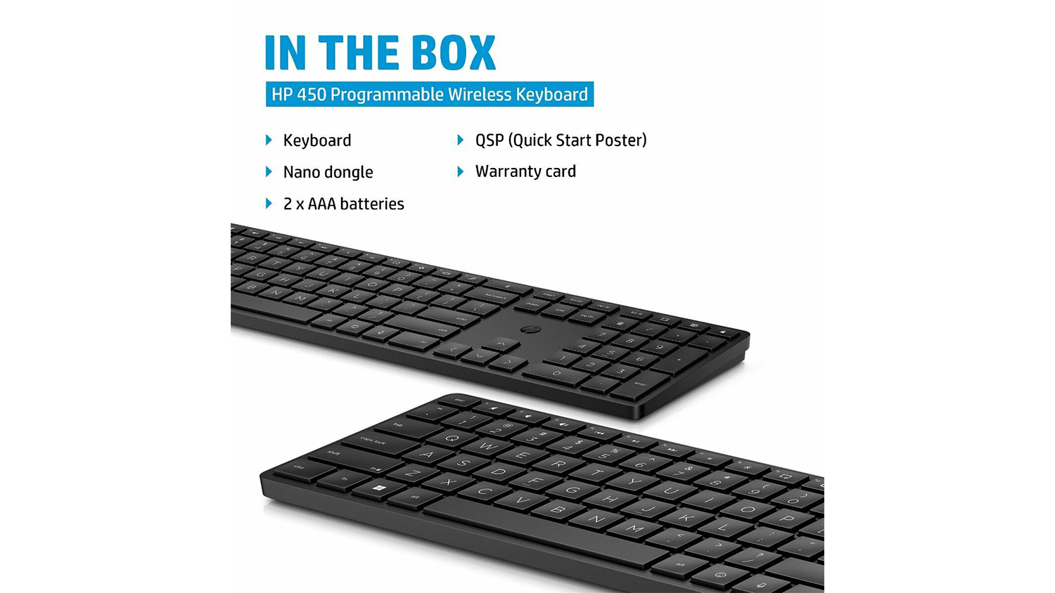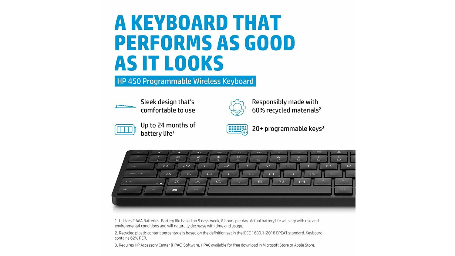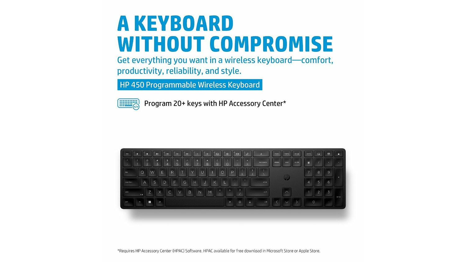 Perfectly blending efficiency and accuracy, the HP 450 Programmable Wireless Keyboard is a perfect companion for tackling your daily productivity tasks. This device highlights contoured keycaps with 2.0mm travel to ensure a seamless typing experience every time. It also features adjustable legs for enhanced comfort. Plus, it comes with over 20 customisable keys, so you can enjoy a more streamlined workflow.