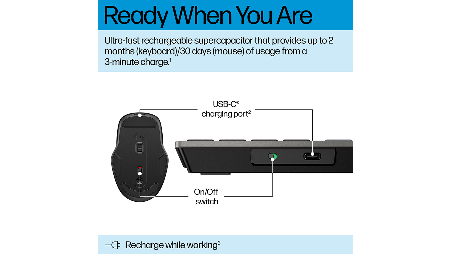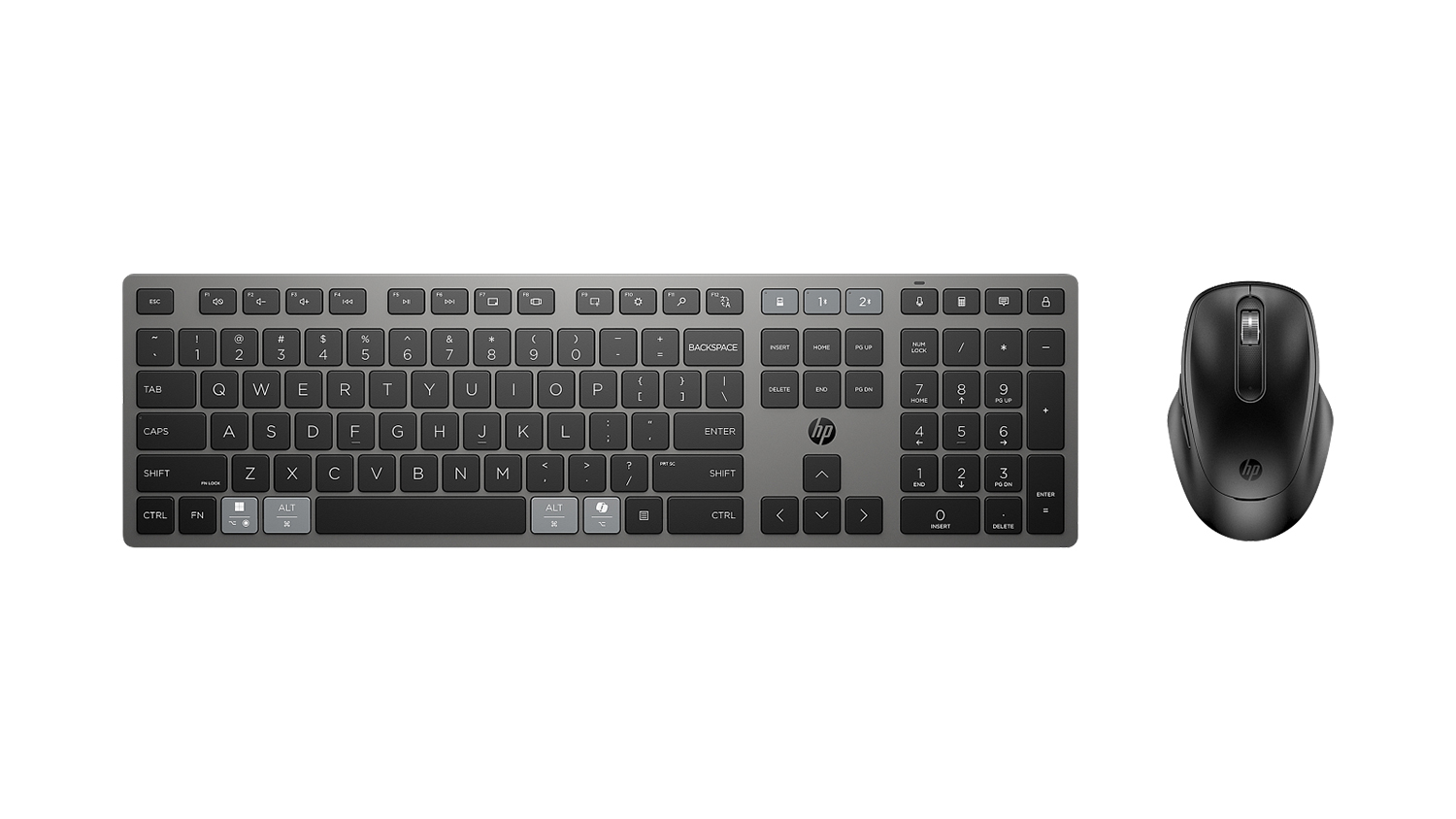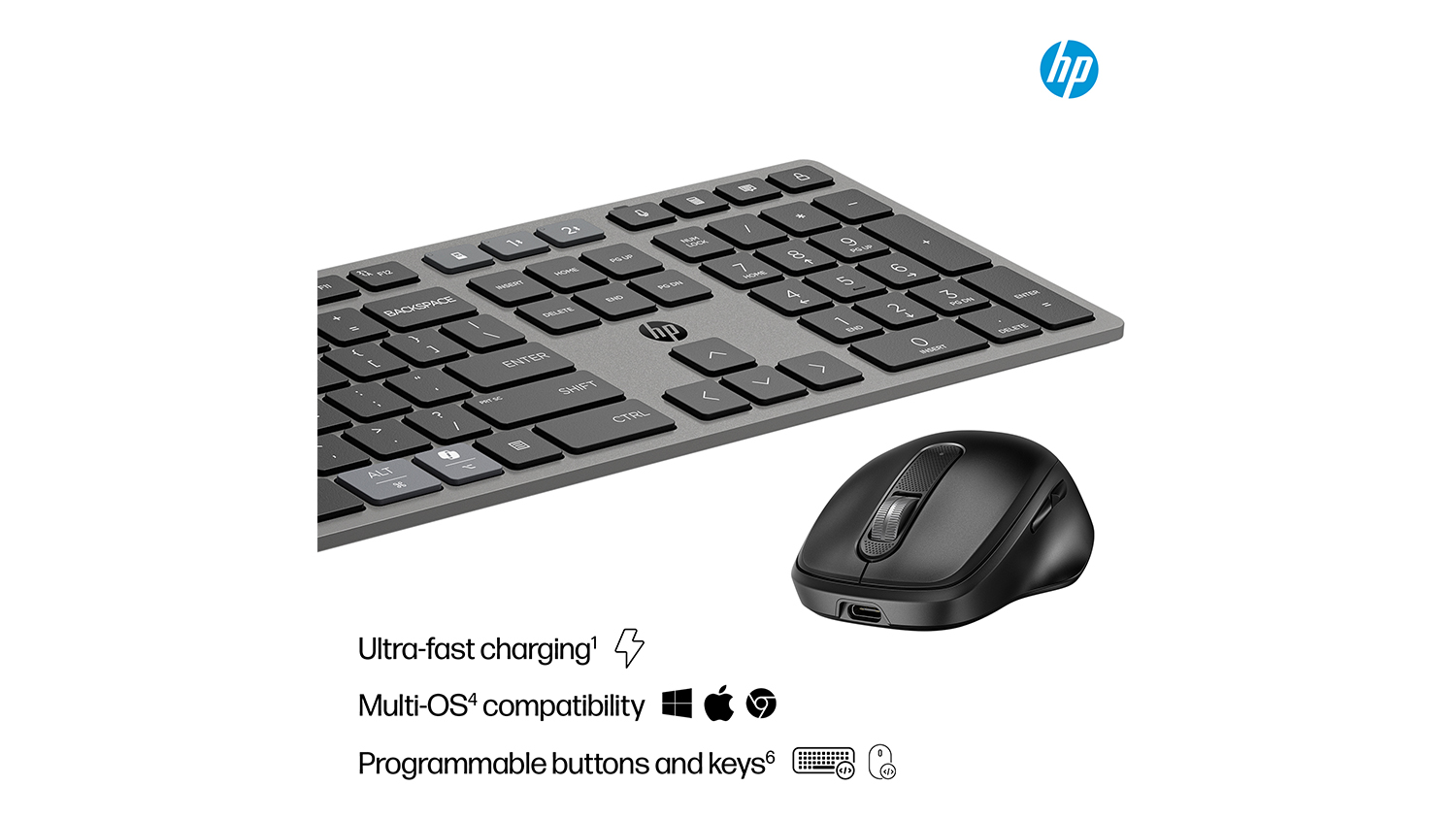 Whether at home or on the move, the HP 720 Multi-Device Rechargeable Wireless Keyboard & Mouse Combo keeps you working efficiently. This set features a full-sized keyboard and multi-surface mouse, which offer programmable controls and Microsoft Copilot support to help you power through your projects. Plus, with long battery life and quick charging, you can enjoy less downtime and enhanced productivity!