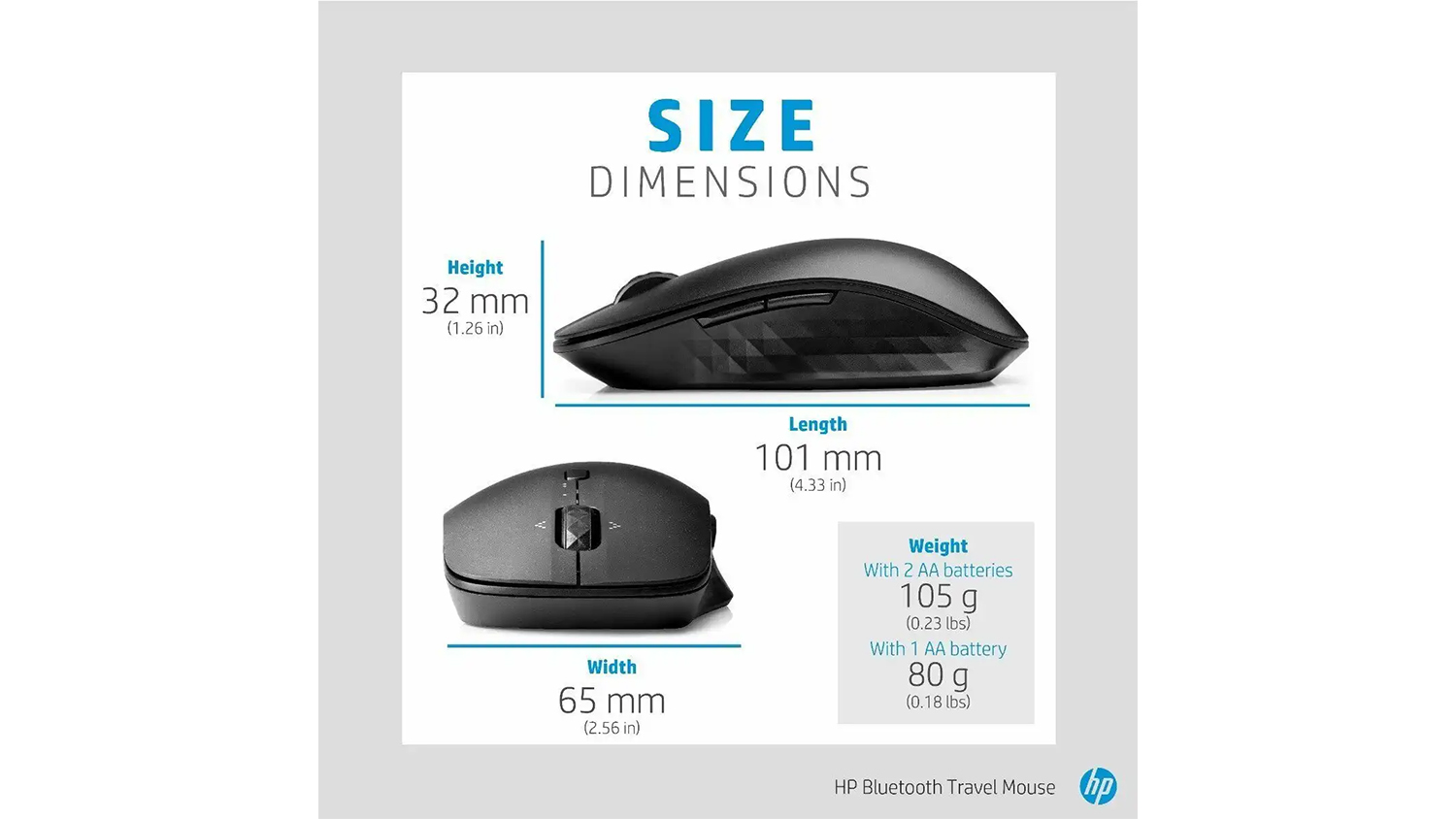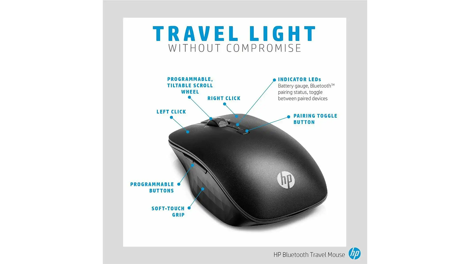 Enjoy superb productivity on the go with the HP Travel Wireless Mouse. A handy companion for your digital tasks, this mouse lets you enjoy smooth tracking on any surface. It also offers programmable buttons to further streamline your workflow. Plus, it supports dual Bluetooth pairing, so you can seamlessly switch between your two devices with just a single push of a button.