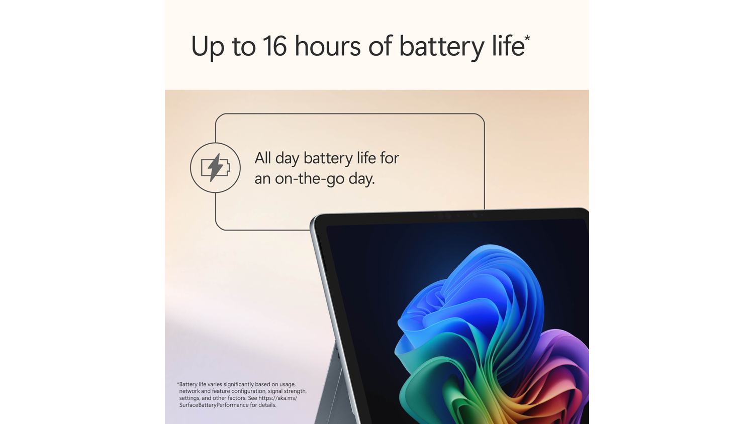**Battery life varies significantly based on device configuration, usage, network and feature configuration, signal strength, settings and other factors. See Surface Battery Performance for details.