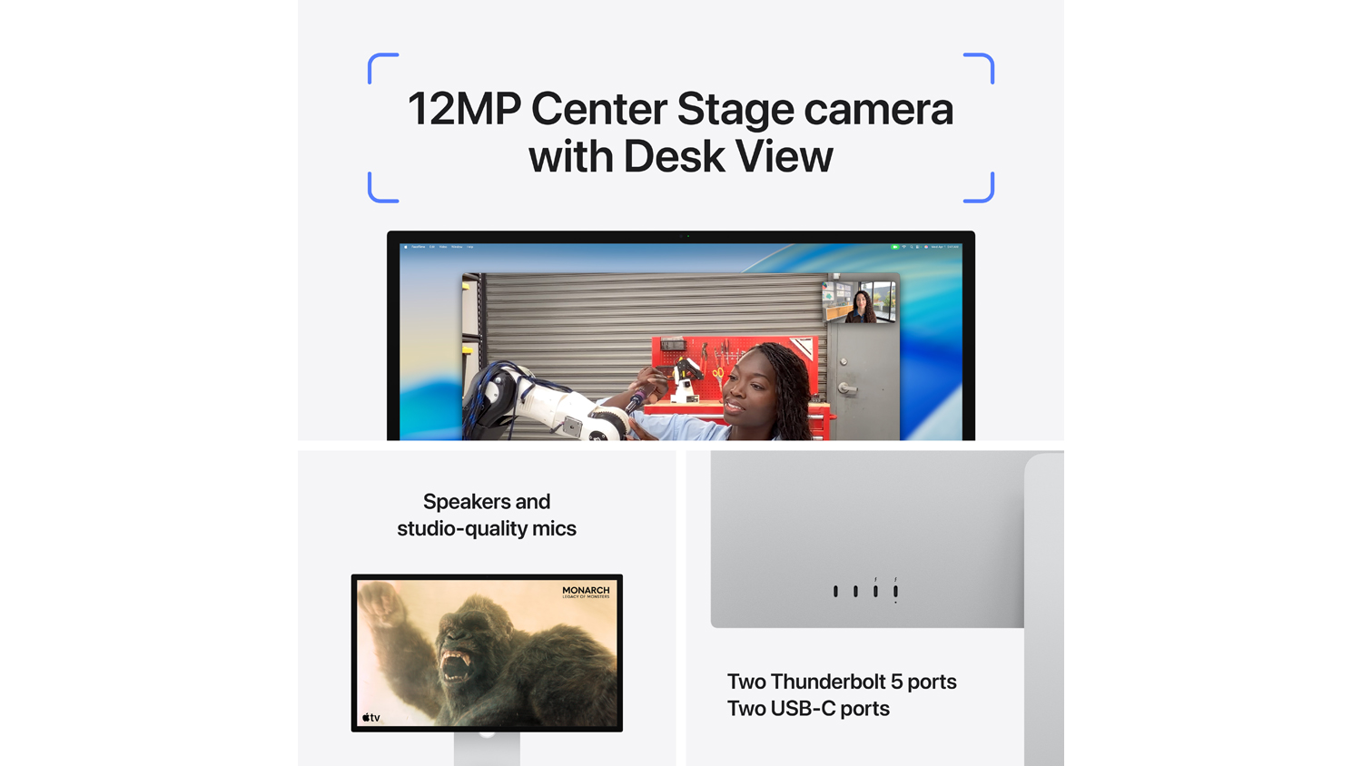 An immersive 27-inch 5K Retina display1, 12MP Center Stage camera with Desk View, advanced mics and speakers, and Thunderbolt 5 ports. Studio Display is the perfect partner for Mac.