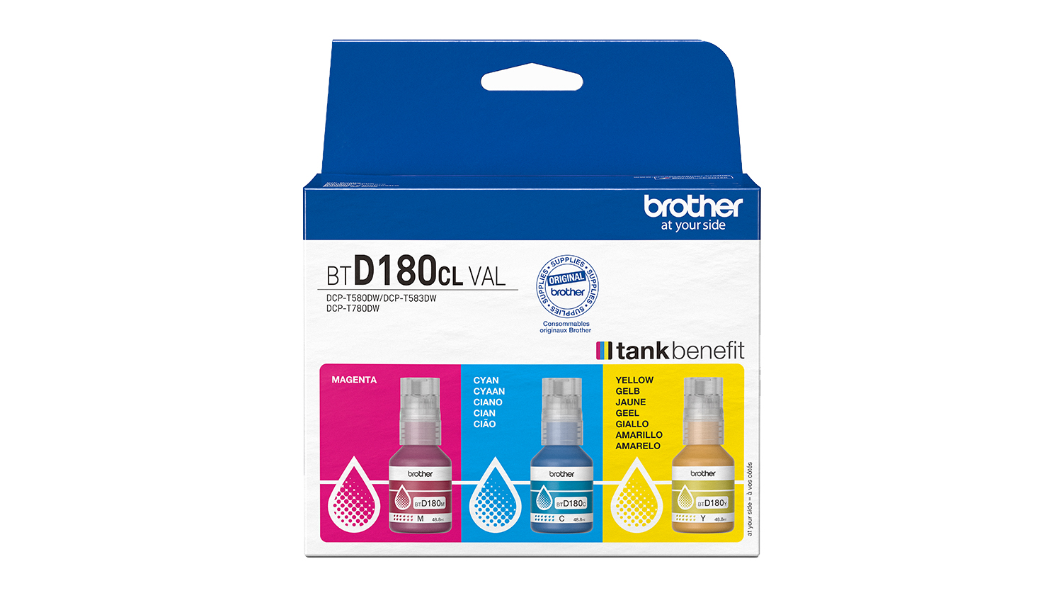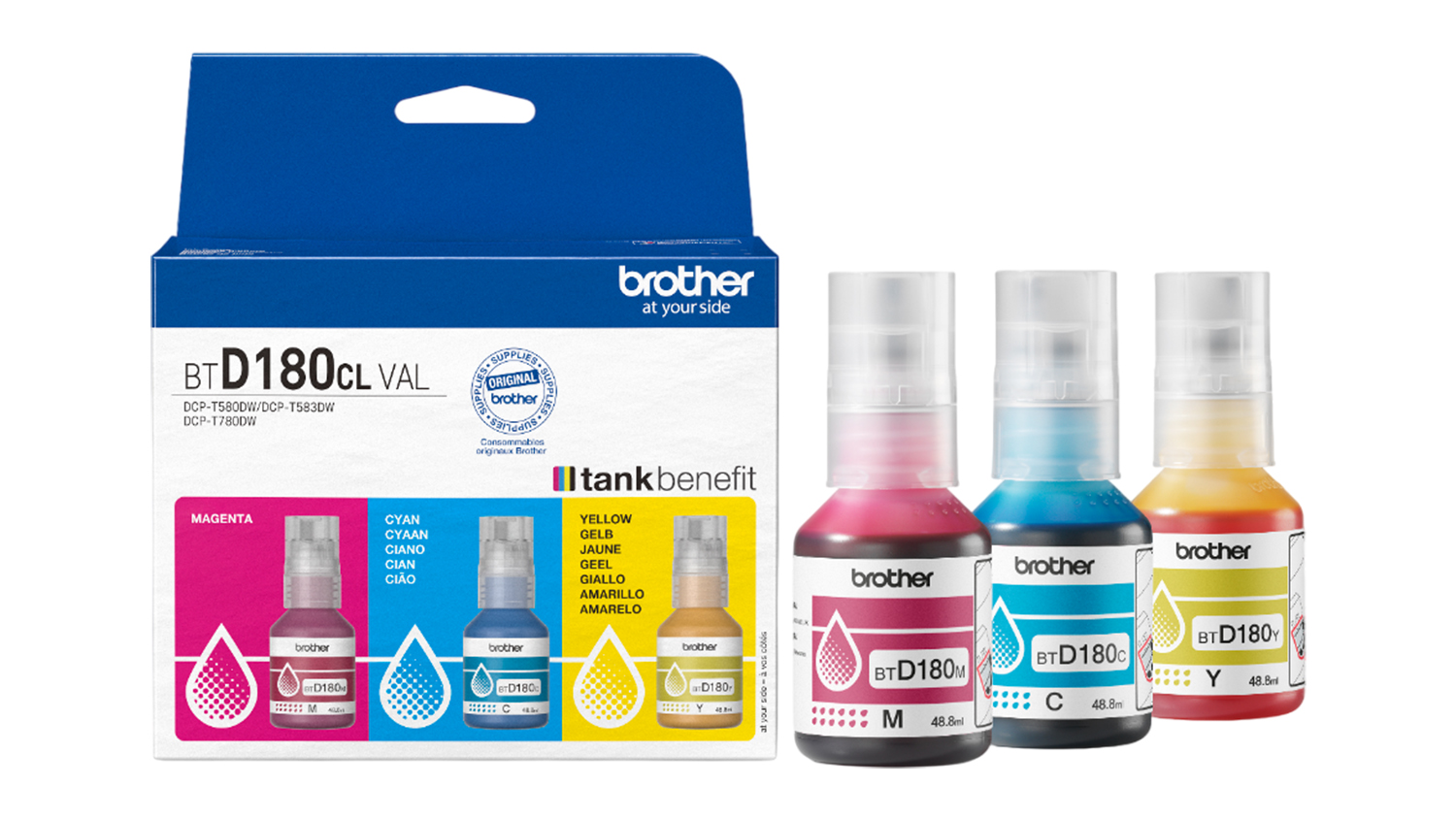 Get bold, vibrant colours in every print with the Brother BTD180CL3PK Ink Bottle 3-Pack. Designed to keep your printer running smoothly, this bundle features the essential colour inks—Cyan, Magenta, and Yellow. It also provides a total of 15,000 pages of yield, so you can produce more documents, projects, and presentations without frequent refilling.