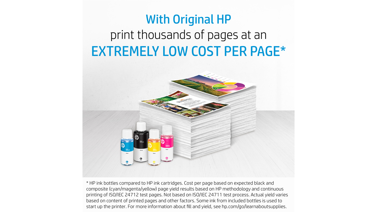 *HP ink bottles compared to HP ink cartridges. Cost per page based on expected black and composite (cyan/magenta/yellow) page yield results based on HP methodology and continuous printing of ISO/IEC 24712 test pages. Not based on ISO/IEC 24711 test process. Actual yield varies based on the content of printed pages and other factors. Some ink from included bottles is used to start up the printer.