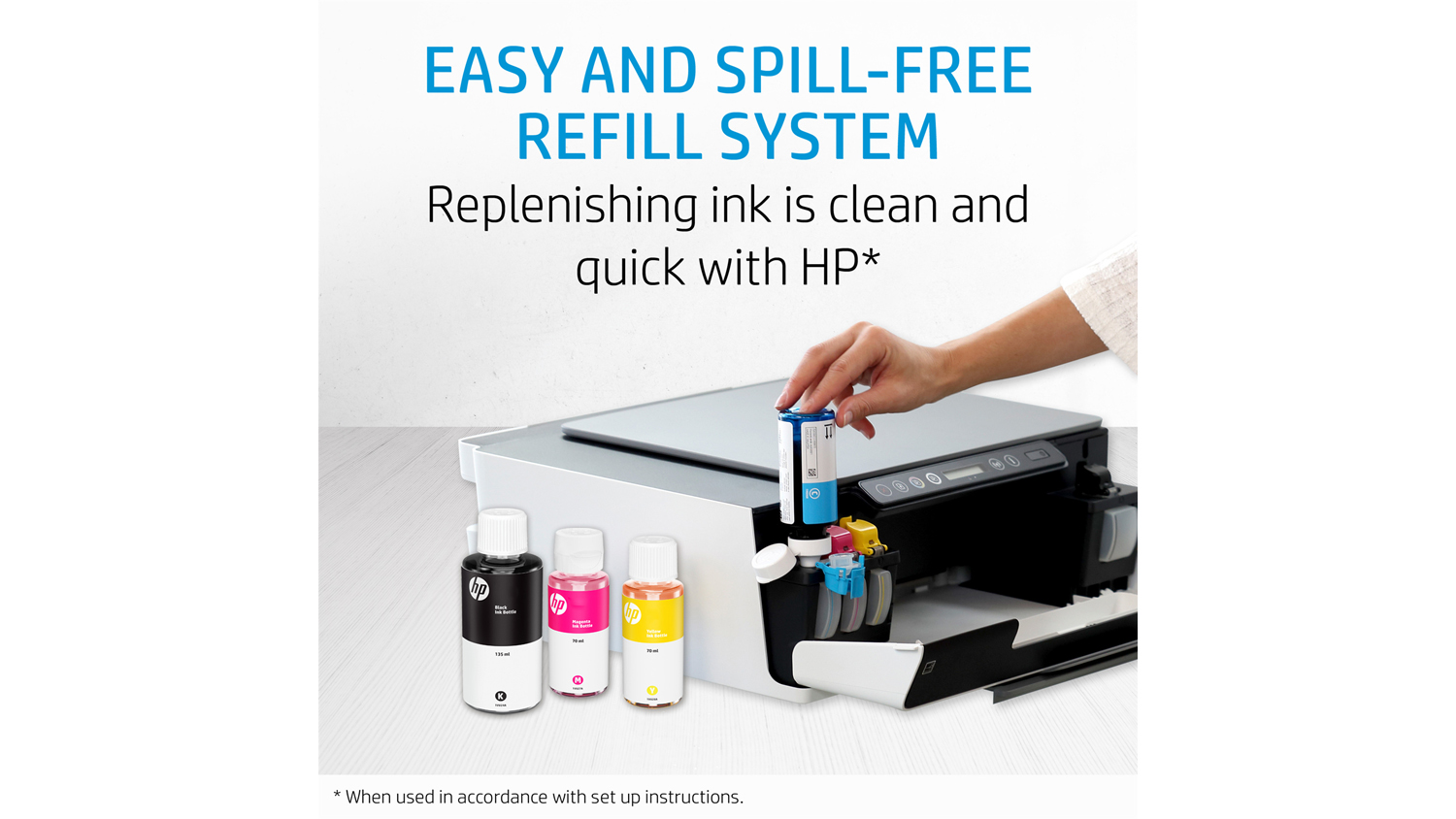 *HP ink bottles compared to HP ink cartridges. Cost per page based on expected black and composite (cyan/magenta/yellow) page yield results based on HP methodology and continuous printing of ISO/IEC 24712 test pages. Not based on ISO/IEC 24711 test process. Actual yield varies based on the content of printed pages and other factors. Some ink from included bottles is used to start up the printer.