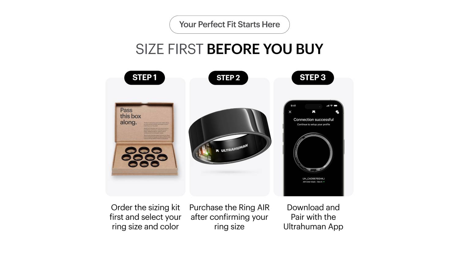 **Important Sizing Information: Ultrahuman Smart Ring sizes are different to standard ring sizes. Your fingers naturally expand and contract, so we recommend wearing your sizing kit ring for at least 24 hours to confirm the best fit for you. For optimal performance, the ring should be worn on the index, middle or ring finger.