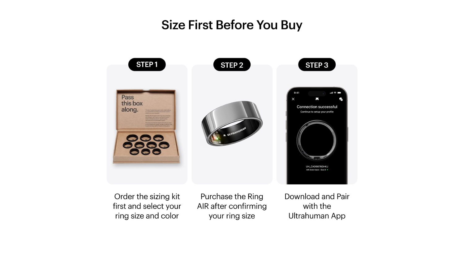 **Important Sizing Information: Ultrahuman Smart Ring sizes are different to standard ring sizes. Your fingers naturally expand and contract, so we recommend wearing your sizing kit ring for at least 24 hours to confirm the best fit for you. For optimal performance, the ring should be worn on the index, middle or ring finger.