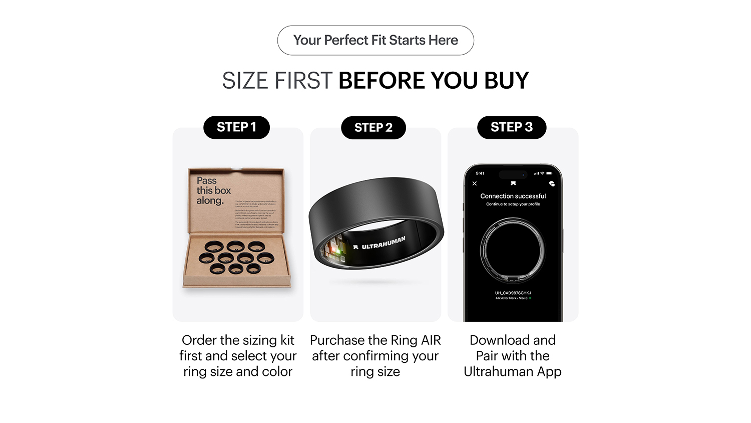 **Important Sizing Information: Ultrahuman Smart Ring sizes are different to standard ring sizes. Your fingers naturally expand and contract, so we recommend wearing your sizing kit ring for at least 24 hours to confirm the best fit for you. For optimal performance, the ring should be worn on the index, middle or ring finger.