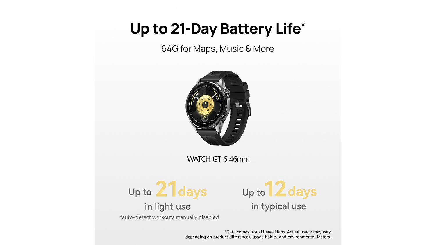 1 Data comes from Huawei labs, and is based on the comparison between HUAWEI WATCH GT 6 46 mm and HUAWEI WATCH GT 5 46 mm.
