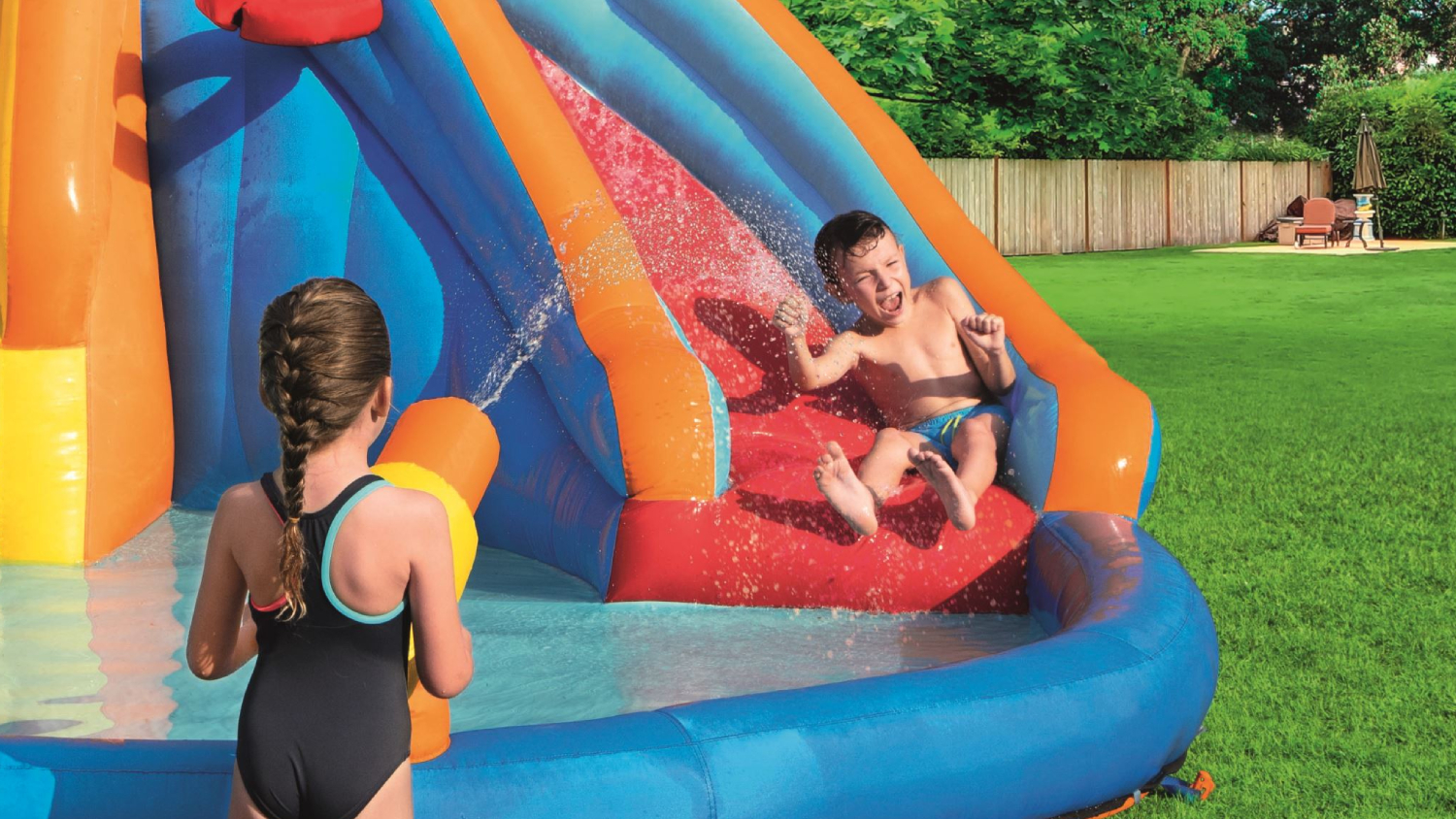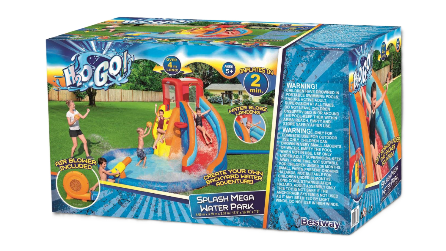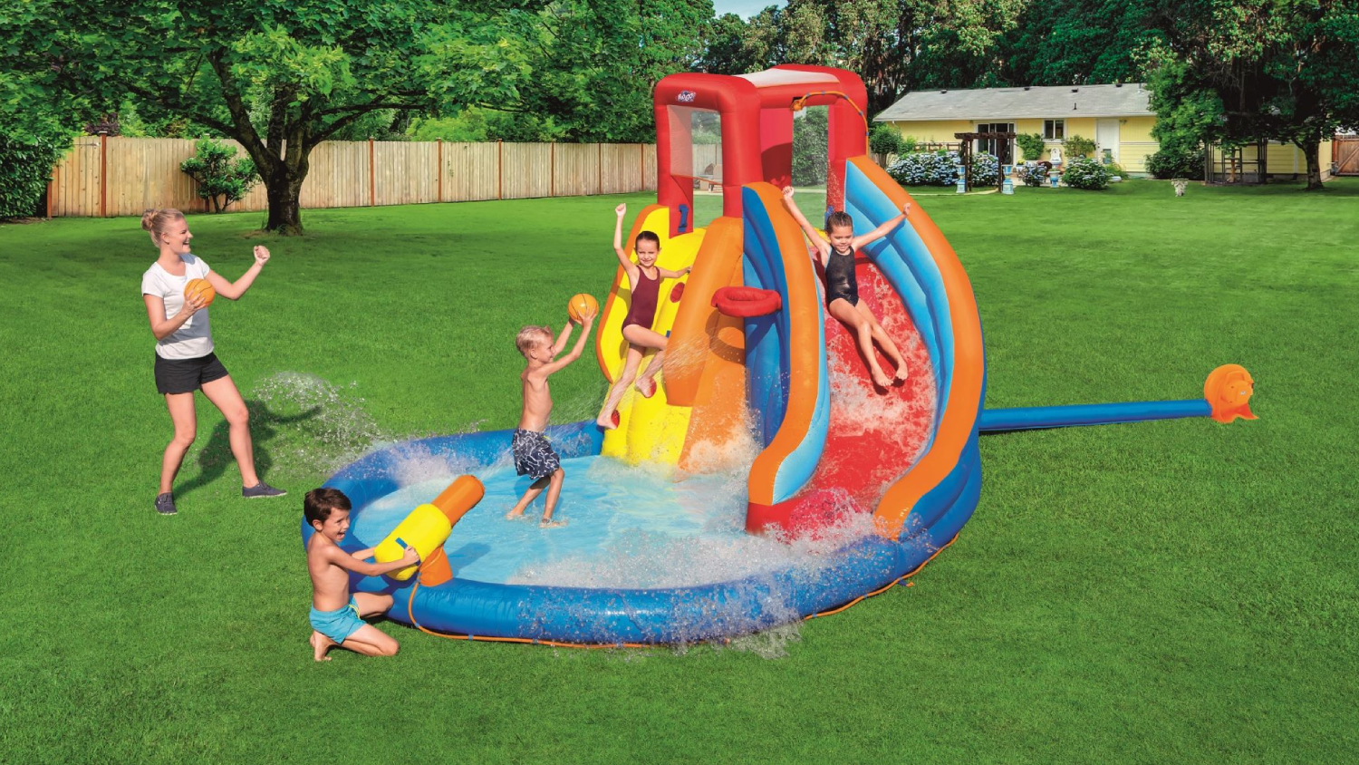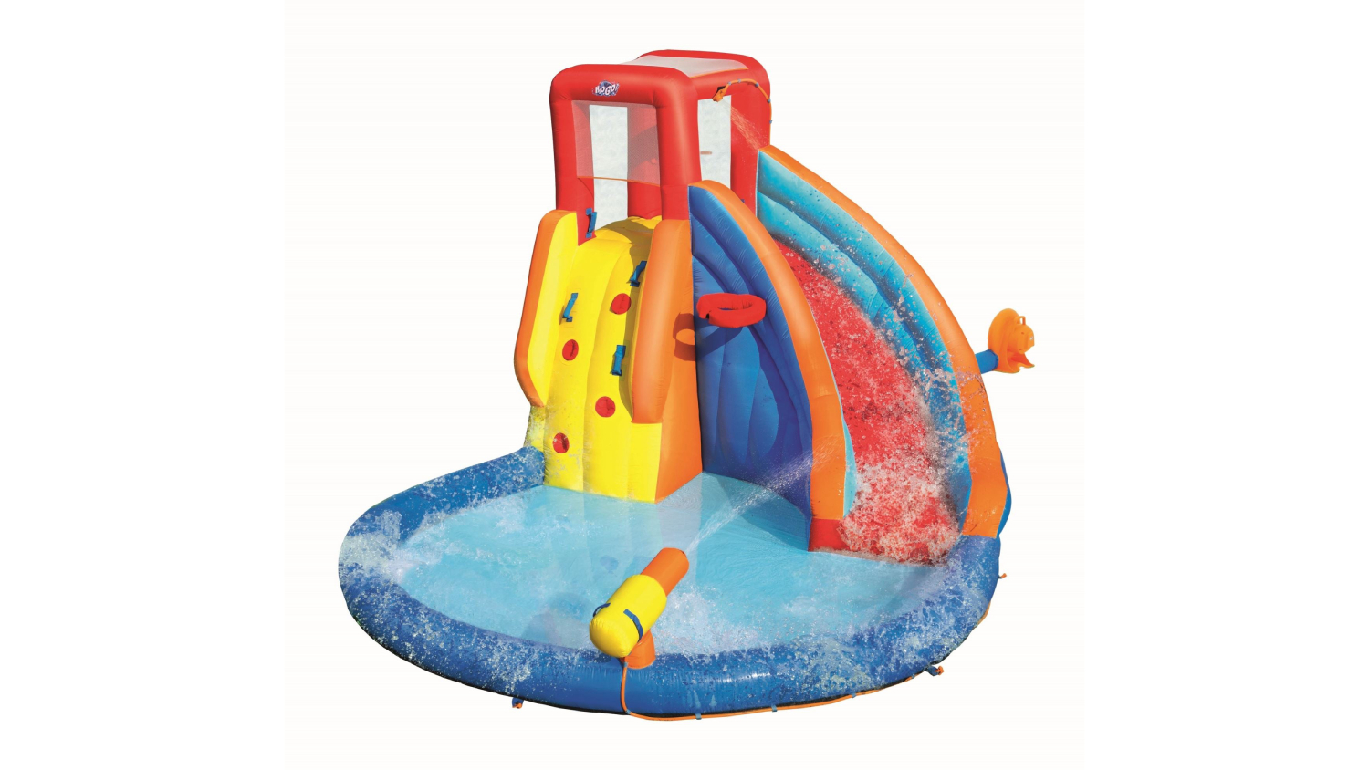 Escape the heat and cool down with the Bestway H2OGO! SplashMega Inflatable Water Park! With a slide, sprinkler, and water gun, this colourful inflatable is designed for hours of splashing fun. Crafted from durable, double-stitched PVC-coated polyester, it inflates in under 2 minutes for instant fun.