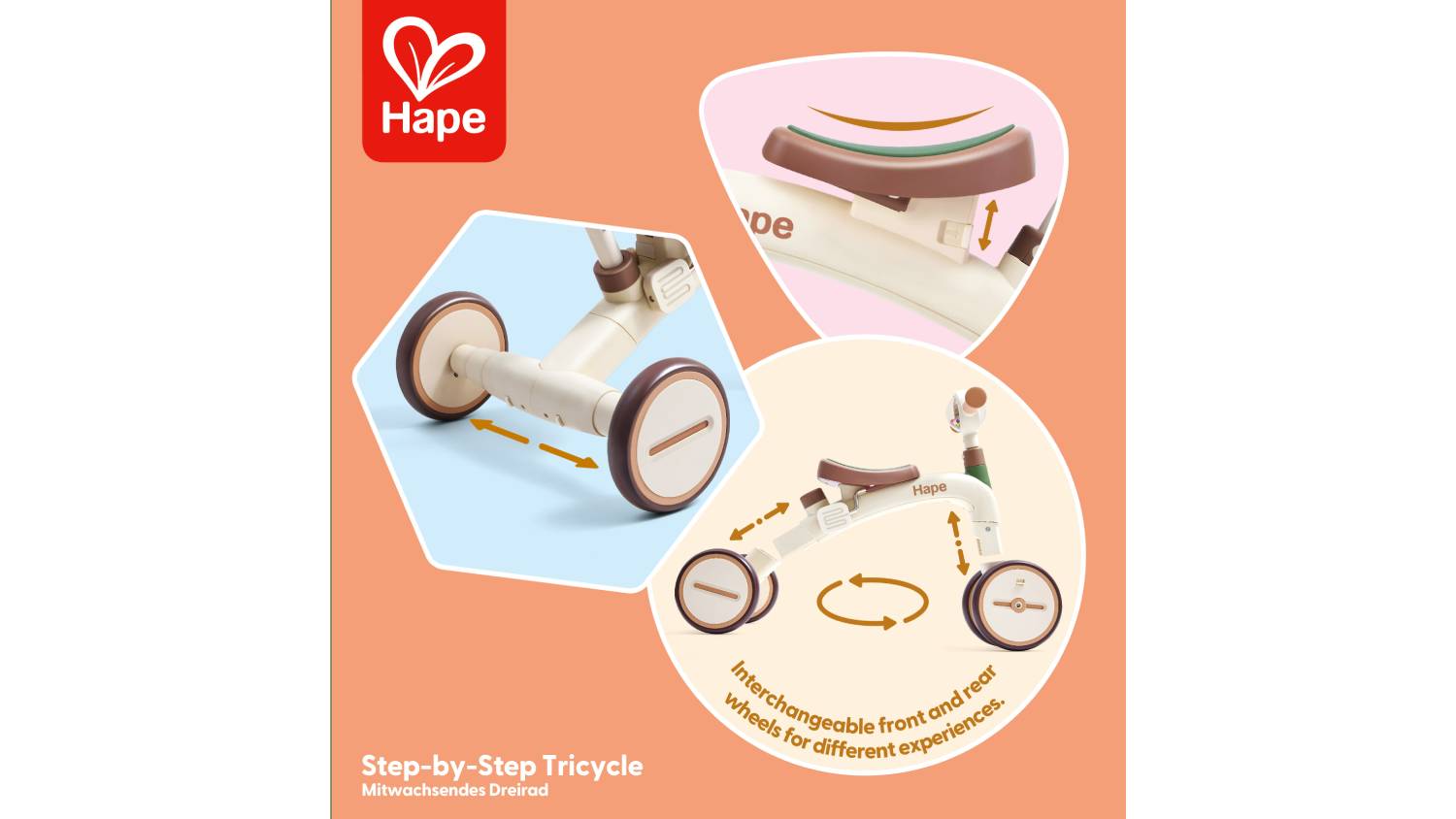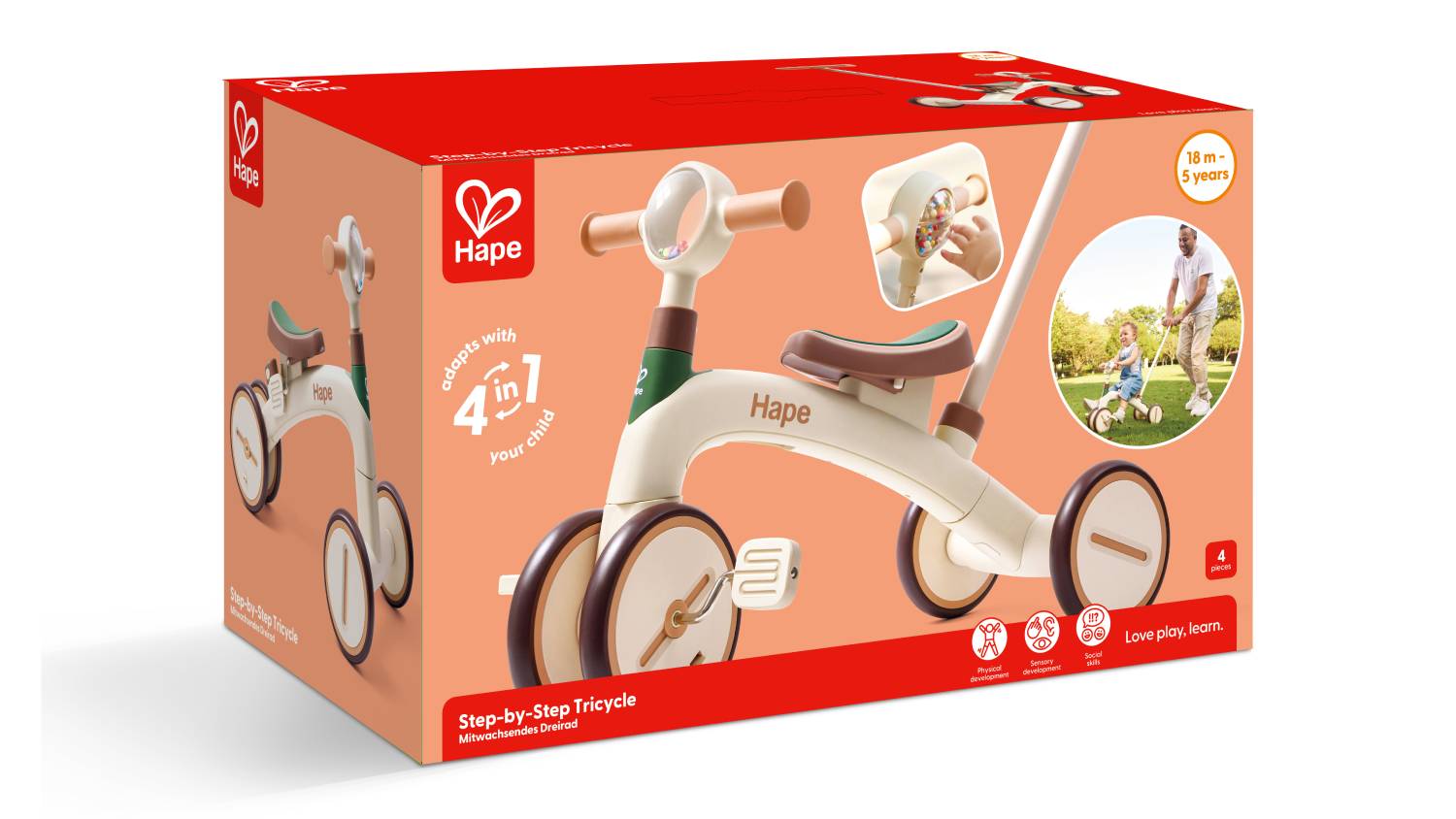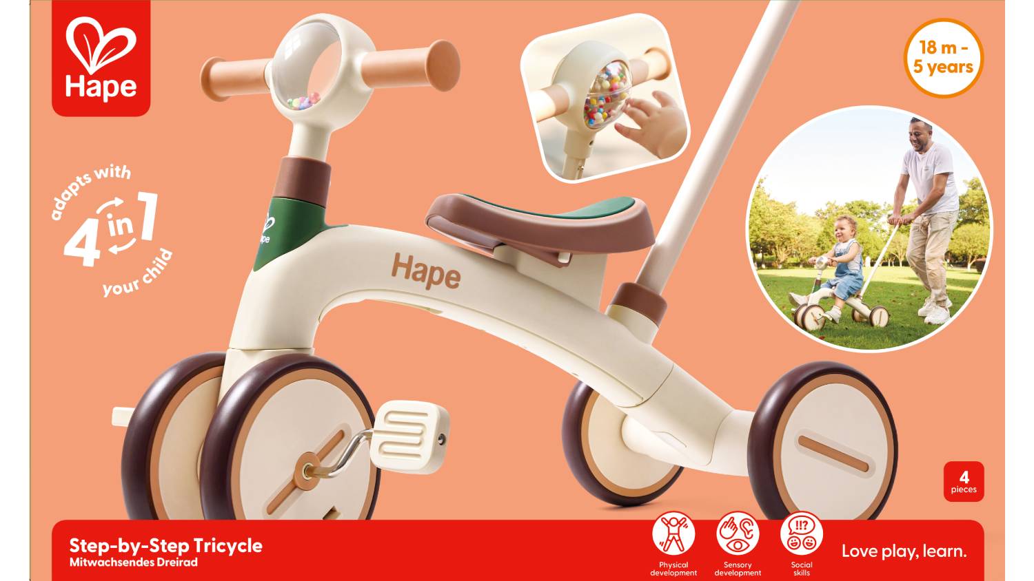 Go from walking to riding with the Hape Step-By-Step Guided Tricycle. This trike is engineered to adapt through four different play modes, from a parent-guided push tricycle to a fully independent balance bike. The easy-to-use adjustable push handle and safety steering make it a breeze for parents, while the durable design and shock-absorbing wheels ensure a smooth, comfortable ride for your little one. This functional and fun trike helps build essential motor skills, balance, and confidence as your child grows.