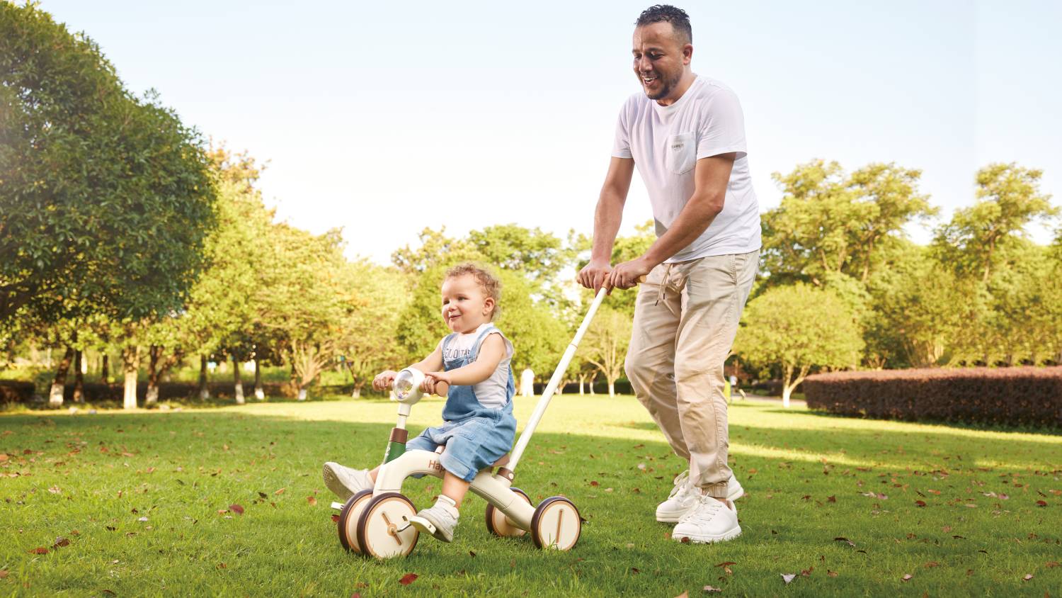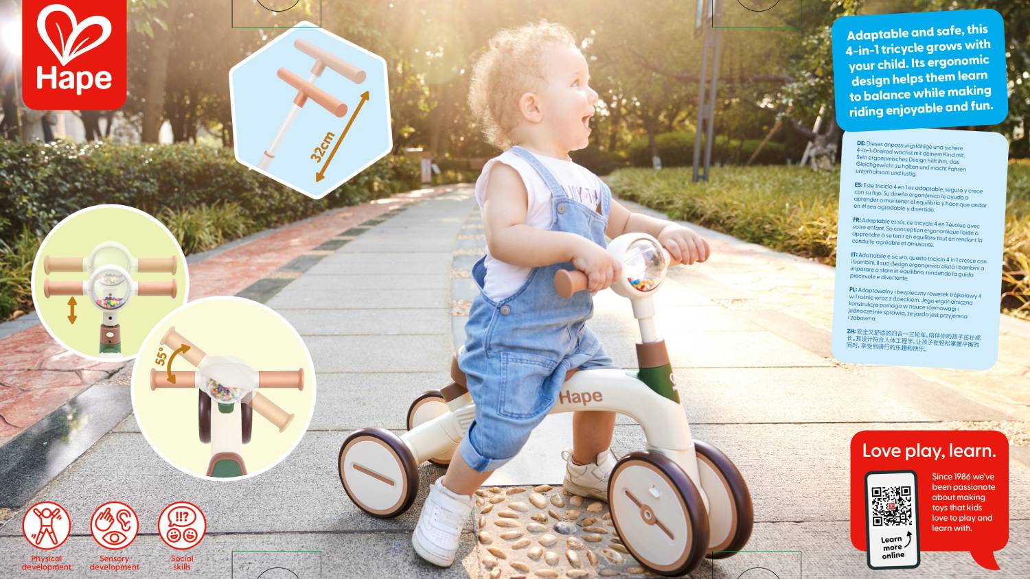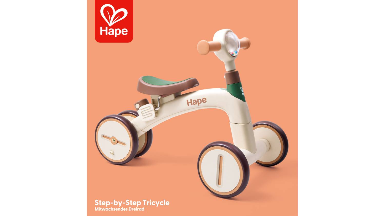 Go from walking to riding with the Hape Step-By-Step Guided Tricycle. This trike is engineered to adapt through four different play modes, from a parent-guided push tricycle to a fully independent balance bike. The easy-to-use adjustable push handle and safety steering make it a breeze for parents, while the durable design and shock-absorbing wheels ensure a smooth, comfortable ride for your little one. This functional and fun trike helps build essential motor skills, balance, and confidence as your child grows.