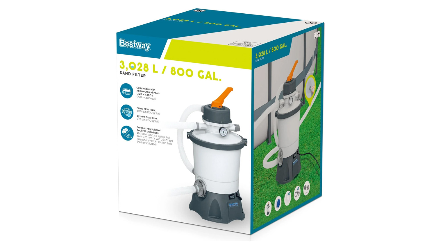 Enjoy effortless pool care with the TSB Living Bestway FlowClear Sand Filter Pump. This unit boasts a robust 800gph (3028L/h) flow rate and a corrosion-resistant filter tank. With its easy installation, 6-position valve, and ChemConnect Dispenser, this pump makes the perfect choice for 1100L to 18100L pools.
