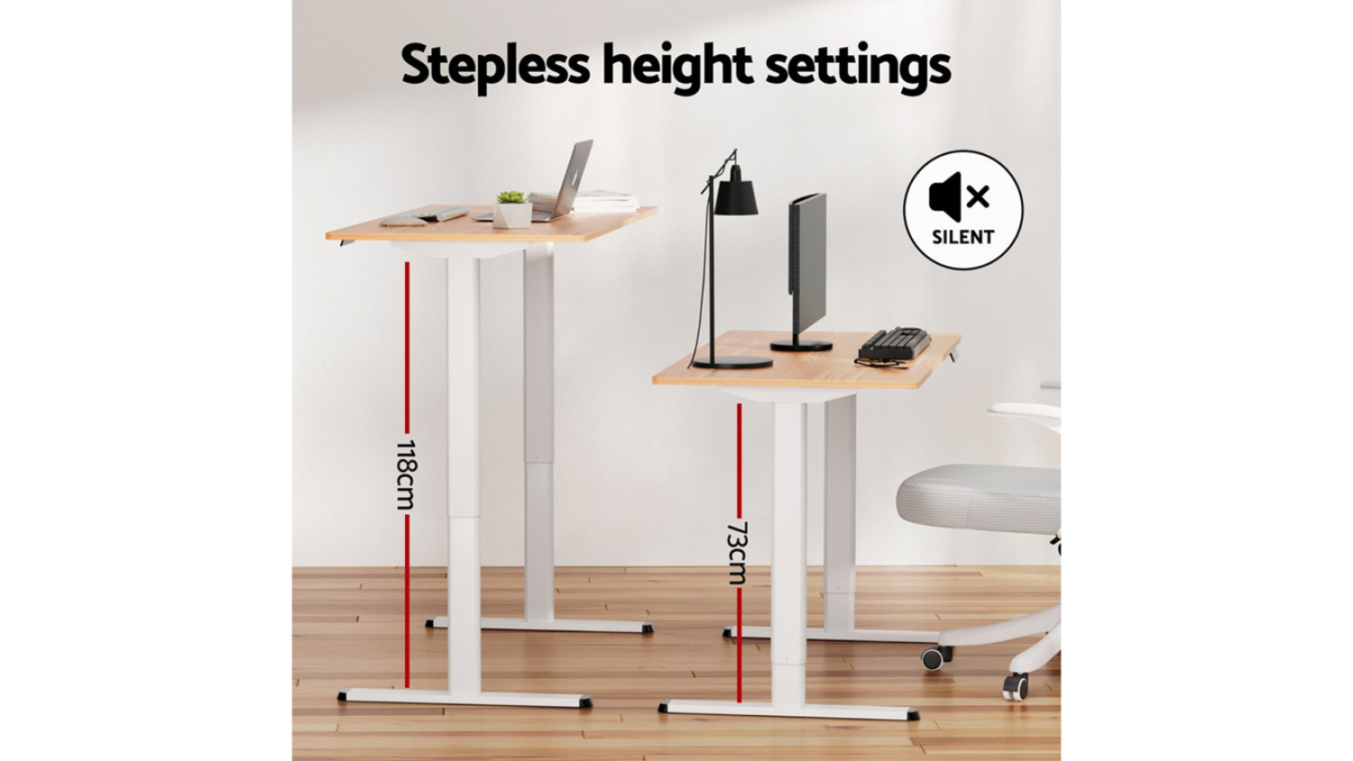 Stay active and work in style with the Artiss Adjustable Motorised Standing Desk. This unit features a motorised height setting (73cm to 118cm), allowing you to transition effortlessly from sitting to standing. Its natural wood desktop adds a modern touch to any office or home setup. Plus, with handy presets, collision sensitivity, quiet operation, soft edge design, and adjustable foot pads, this desk makes a standout choice for your workspace.