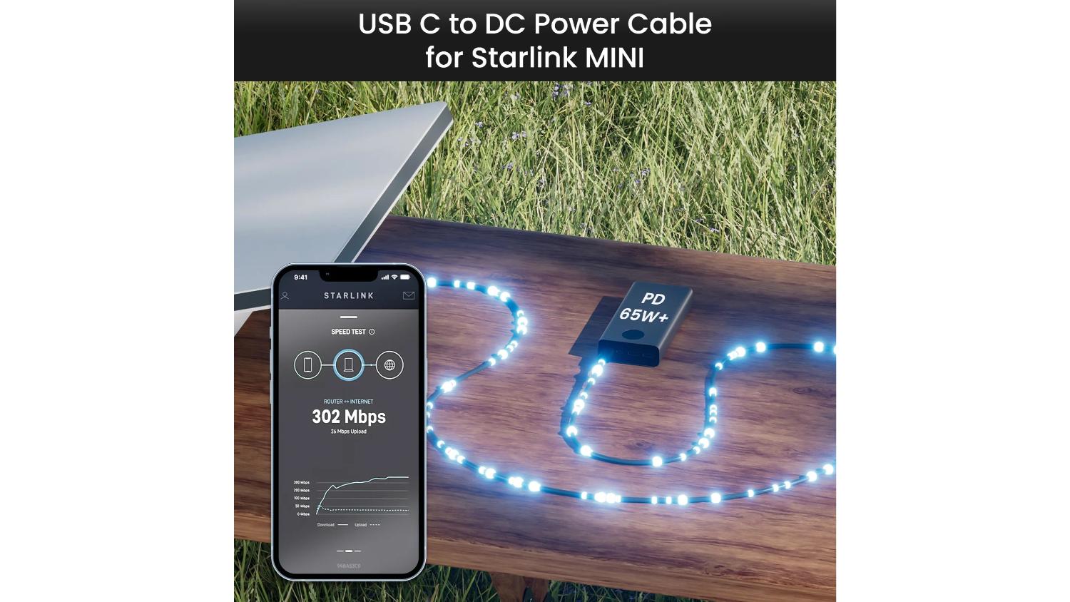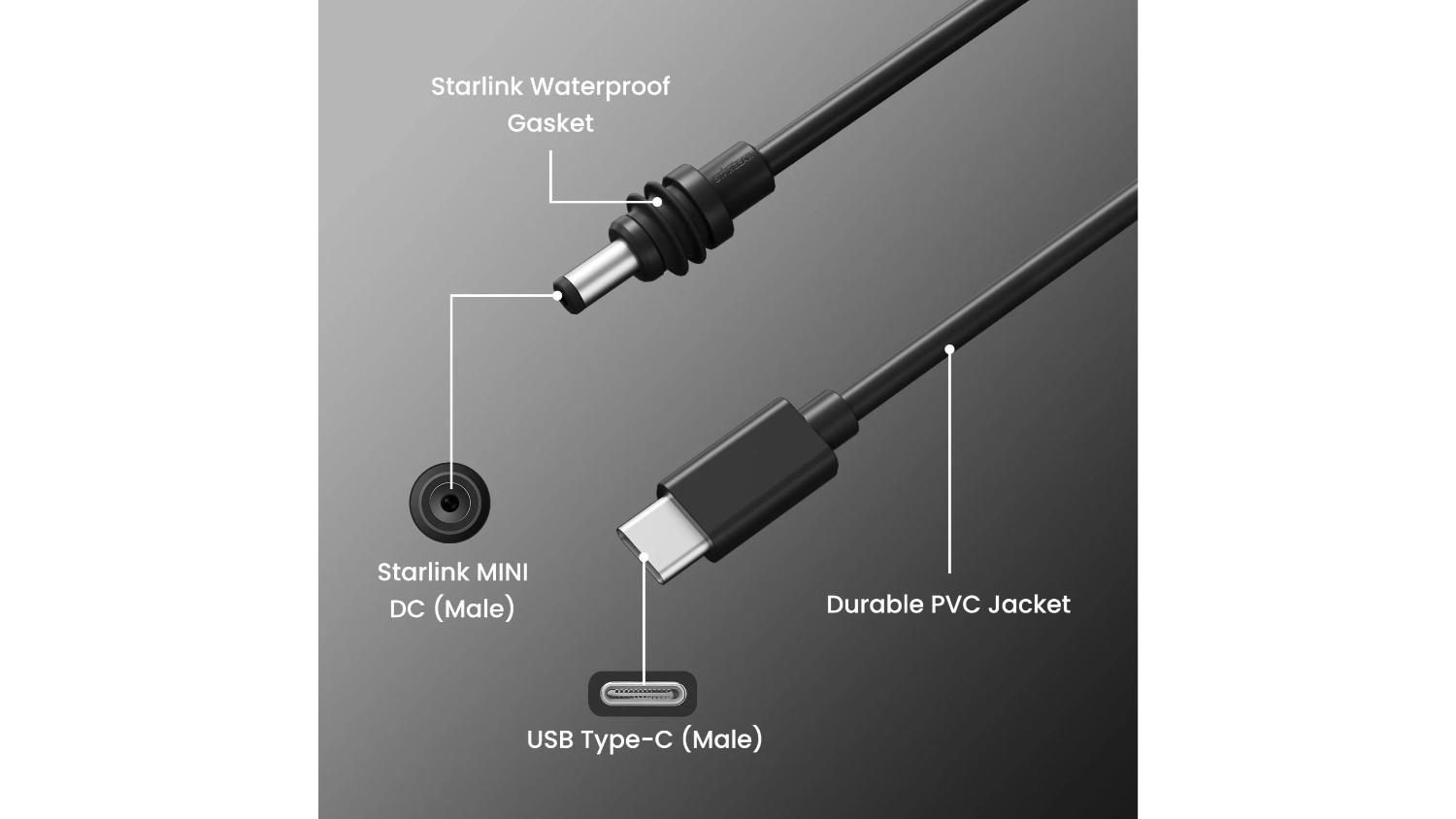 Stay connected anywhere with the STARGEAR Mini 100W USB-C to DC Power Cable for Starlink Mini 5m. This accessory is built with a PD Intelligent Sink chip, sturdy 18AWG wires, and a waterproof gasket. Capable of supplying up to 100W of clean power, simply use it with a 65W+ PD adapter.