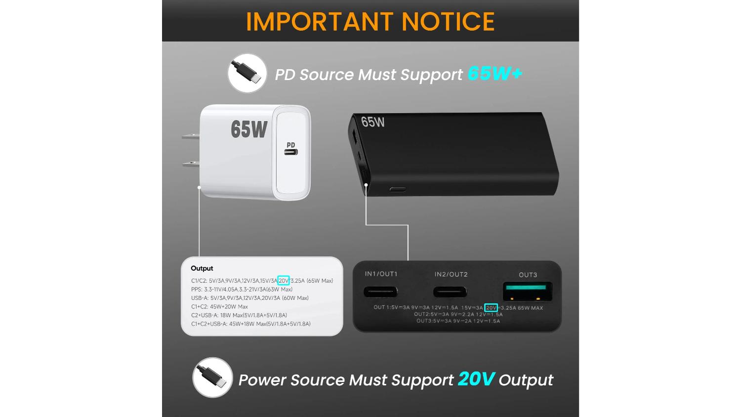 *Note: 20V 3.25A output, the voltage and current capabilities will be listed on your power supply.