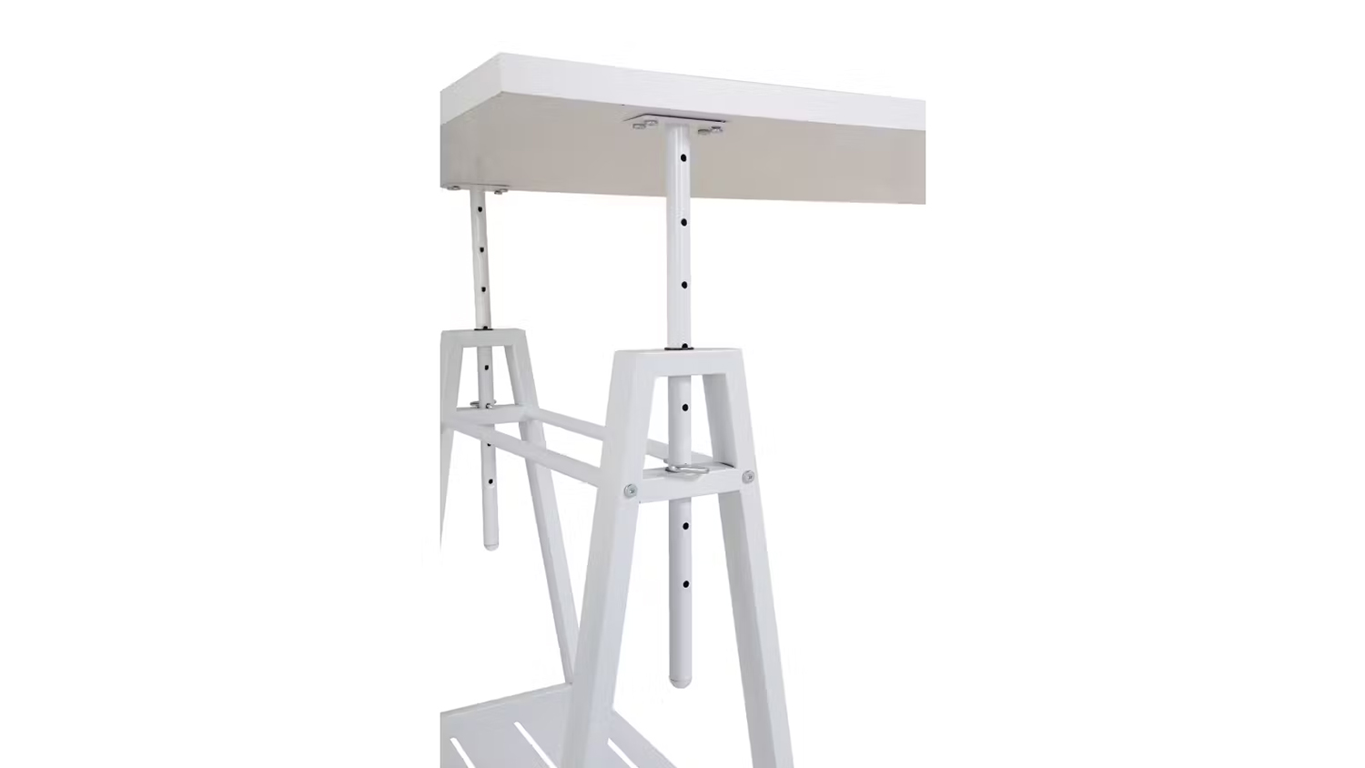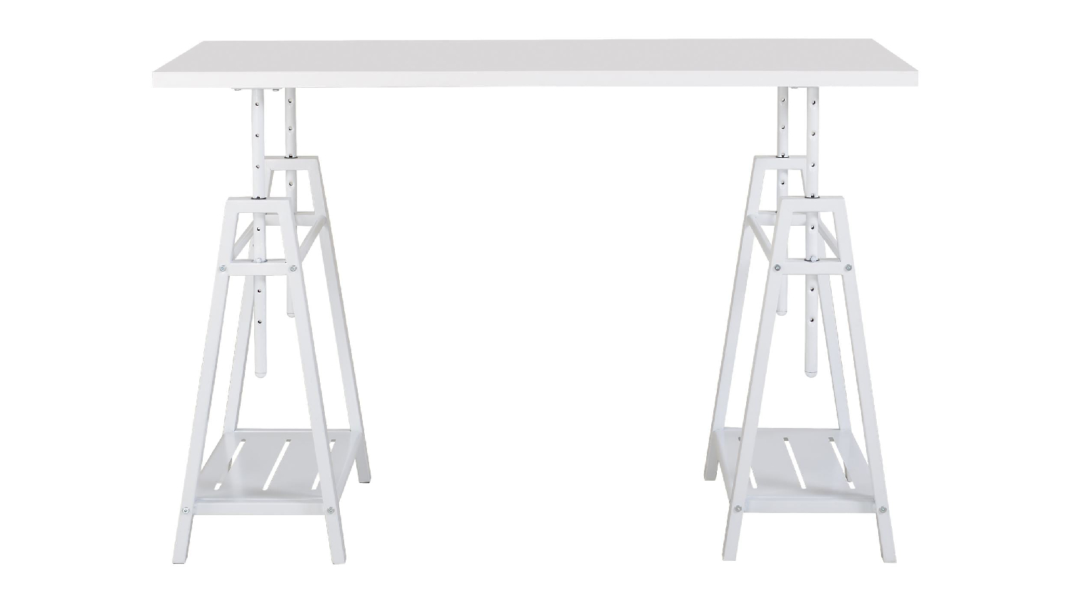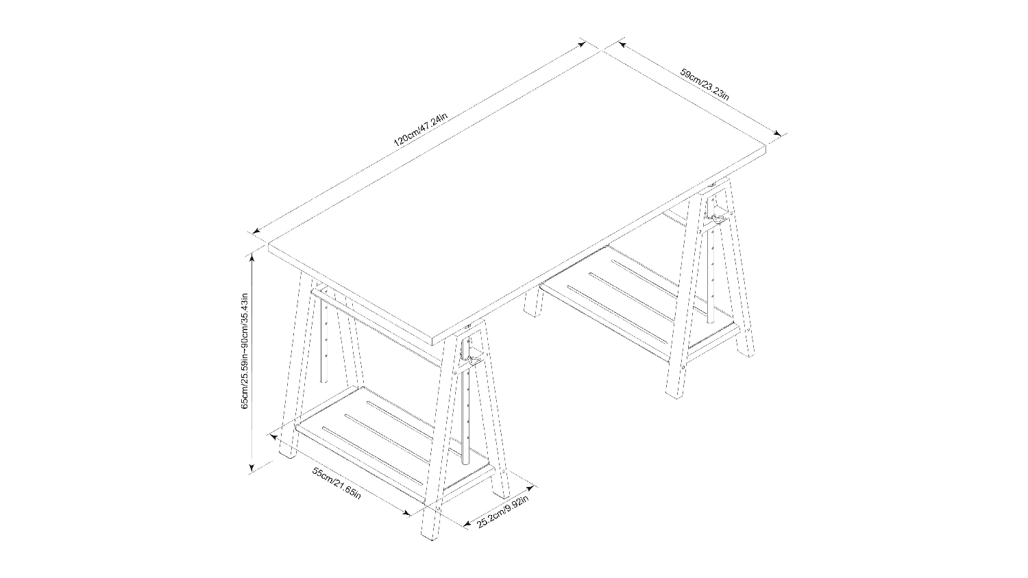 Add function and style to your workspace with the TSB Living Adjustable Metal Frame Desk. Crafted from a thick particleboard top and powder-coated metal frame, it blends strength and style. Plus, the two open shelves double as legs, offering extra storage and a minimalist Scandi touch to your space.