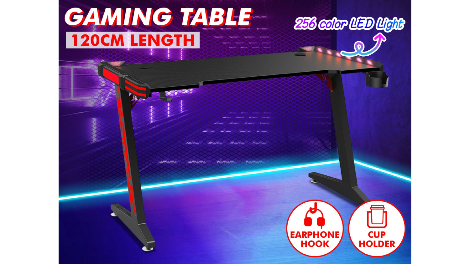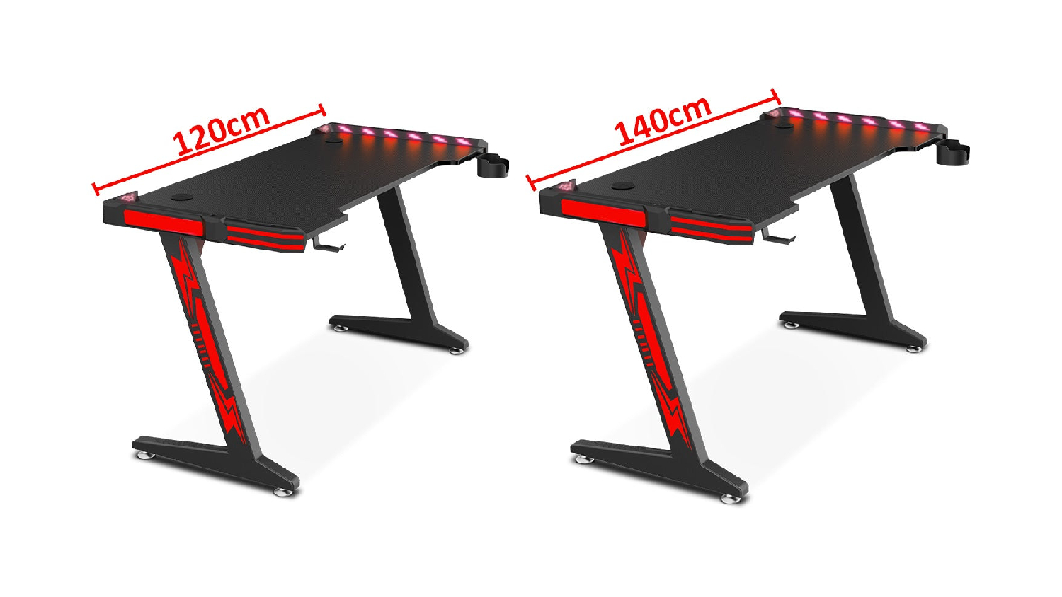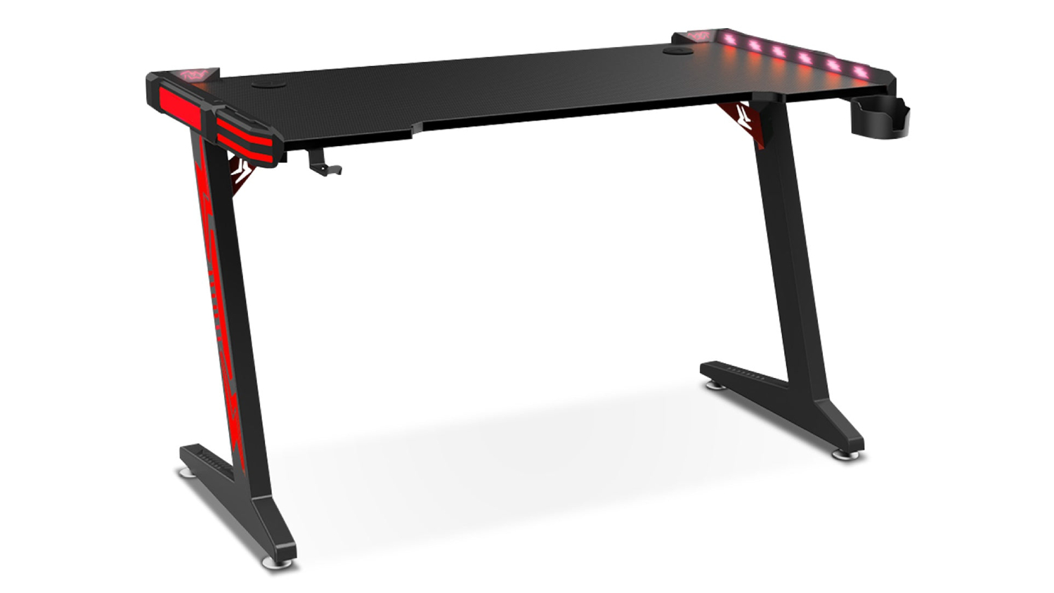 Elevate your gaming experience with the TSB Living LED Gaming Desk with Cup Holder and Hook 140cm. This premium desk boasts a sleek carbon fibre surface, a sturdy Z-shaped steel frame, and captivating RGB lighting effects ensuring a comfortable, immersive, and visually stimulating gaming experience.