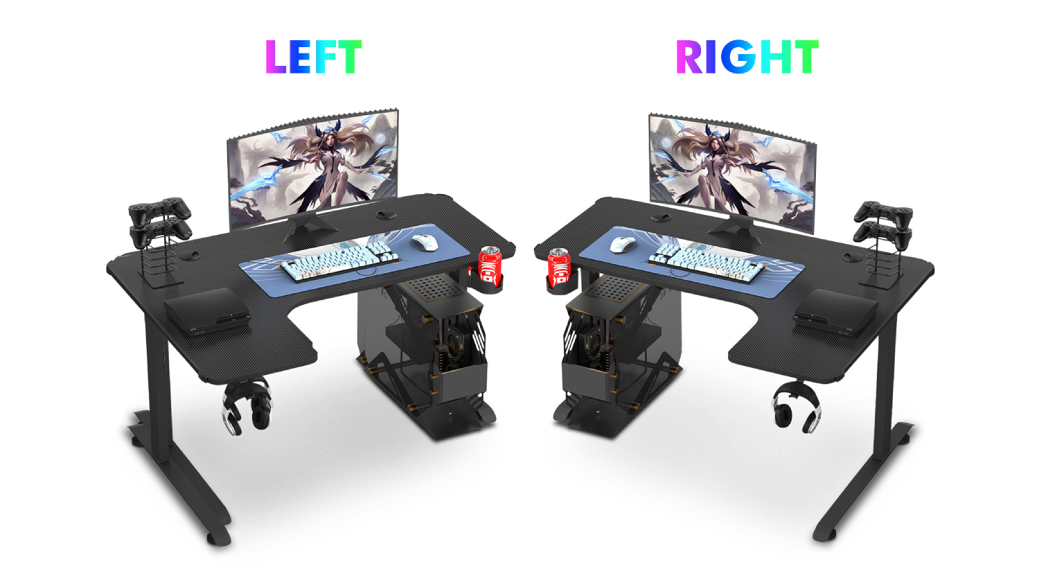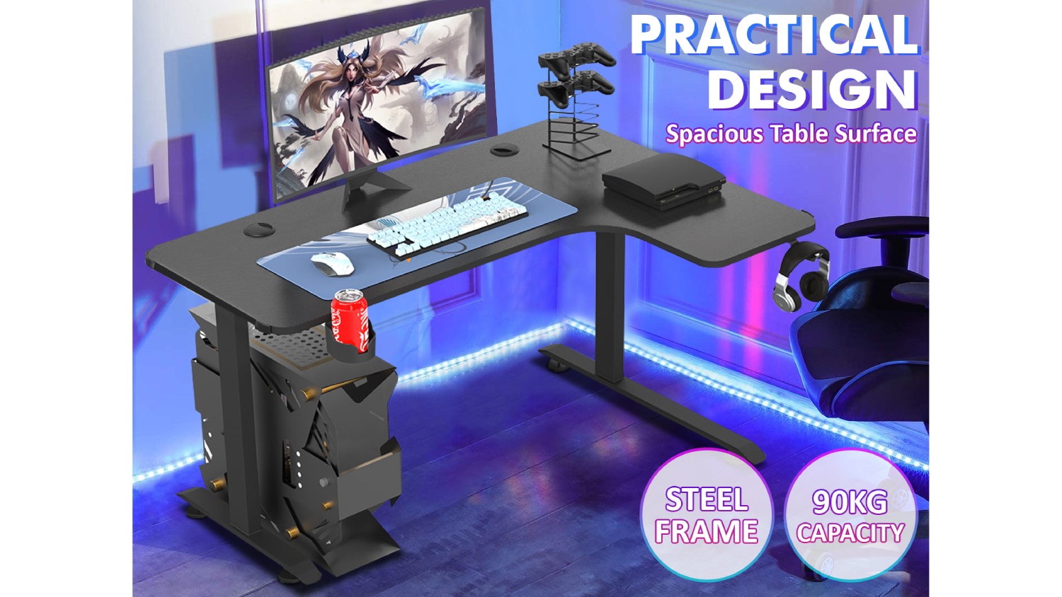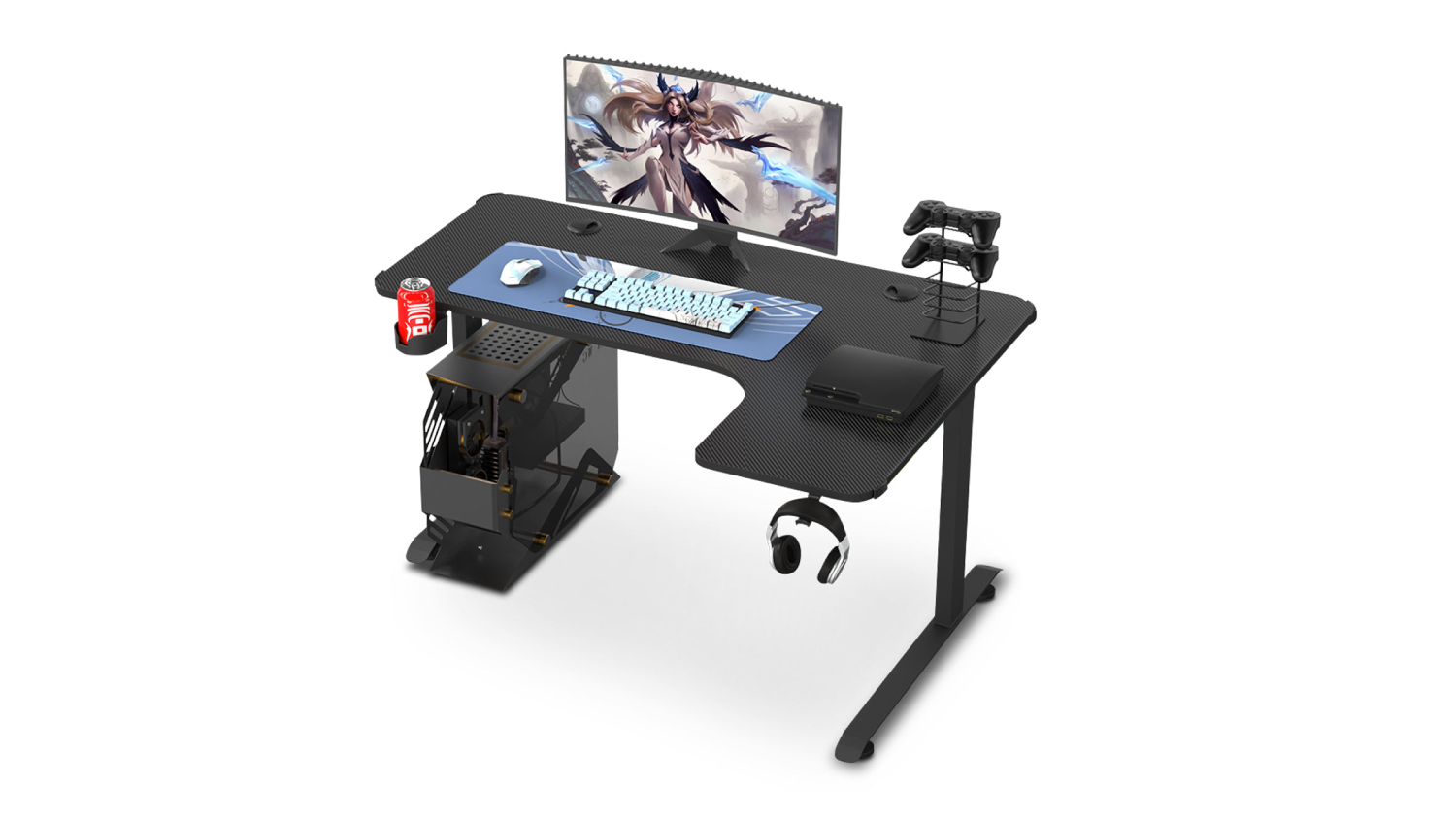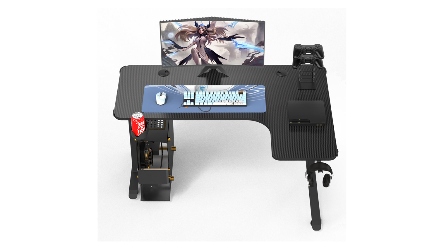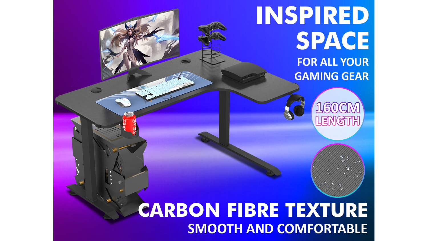 Level up your entertainment setup with the TSB Living Right-Handed L-Shaped Gaming Desk with Cup Holder and PC Tower Mount! This sturdy furniture features a spacious design and a stylish carbon fibre textured top. You can also stay organised with the headphone hook and cup holder. Whether you're playing, working, or studying, this desk is the perfect companion!
