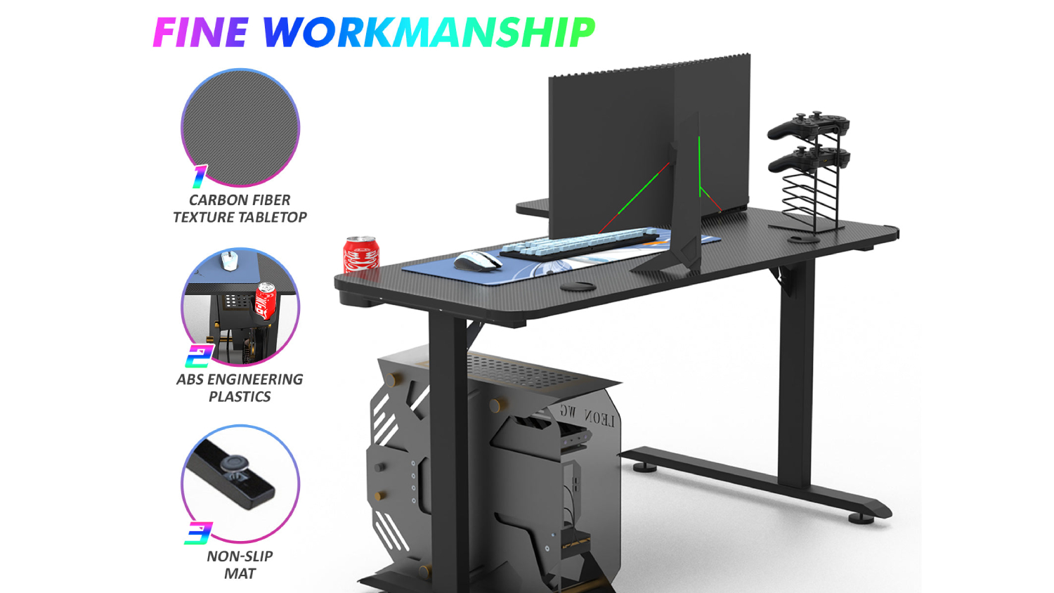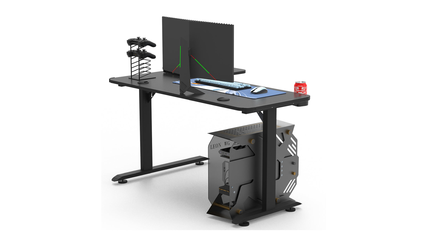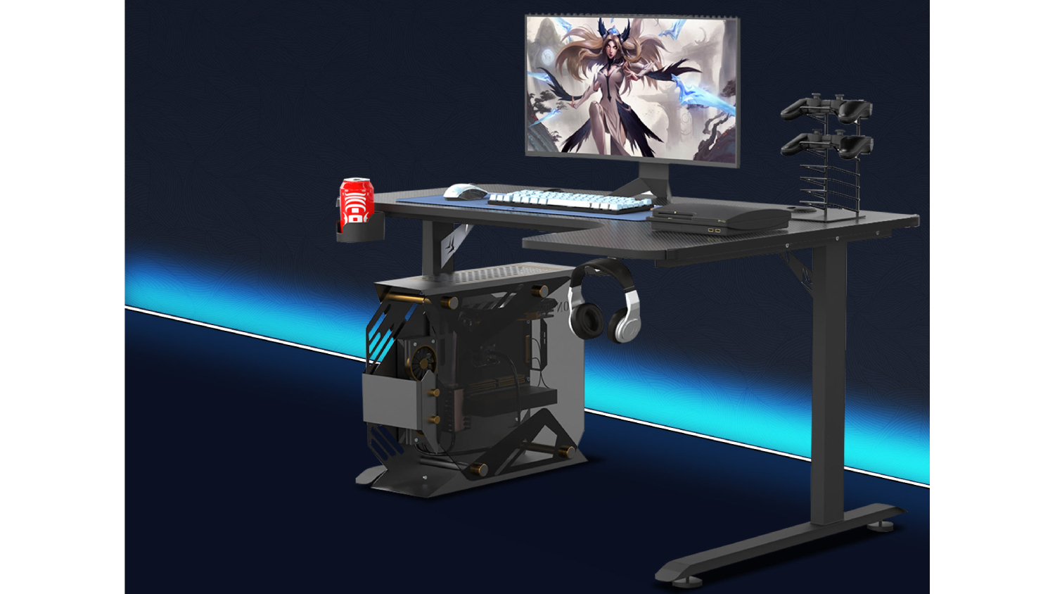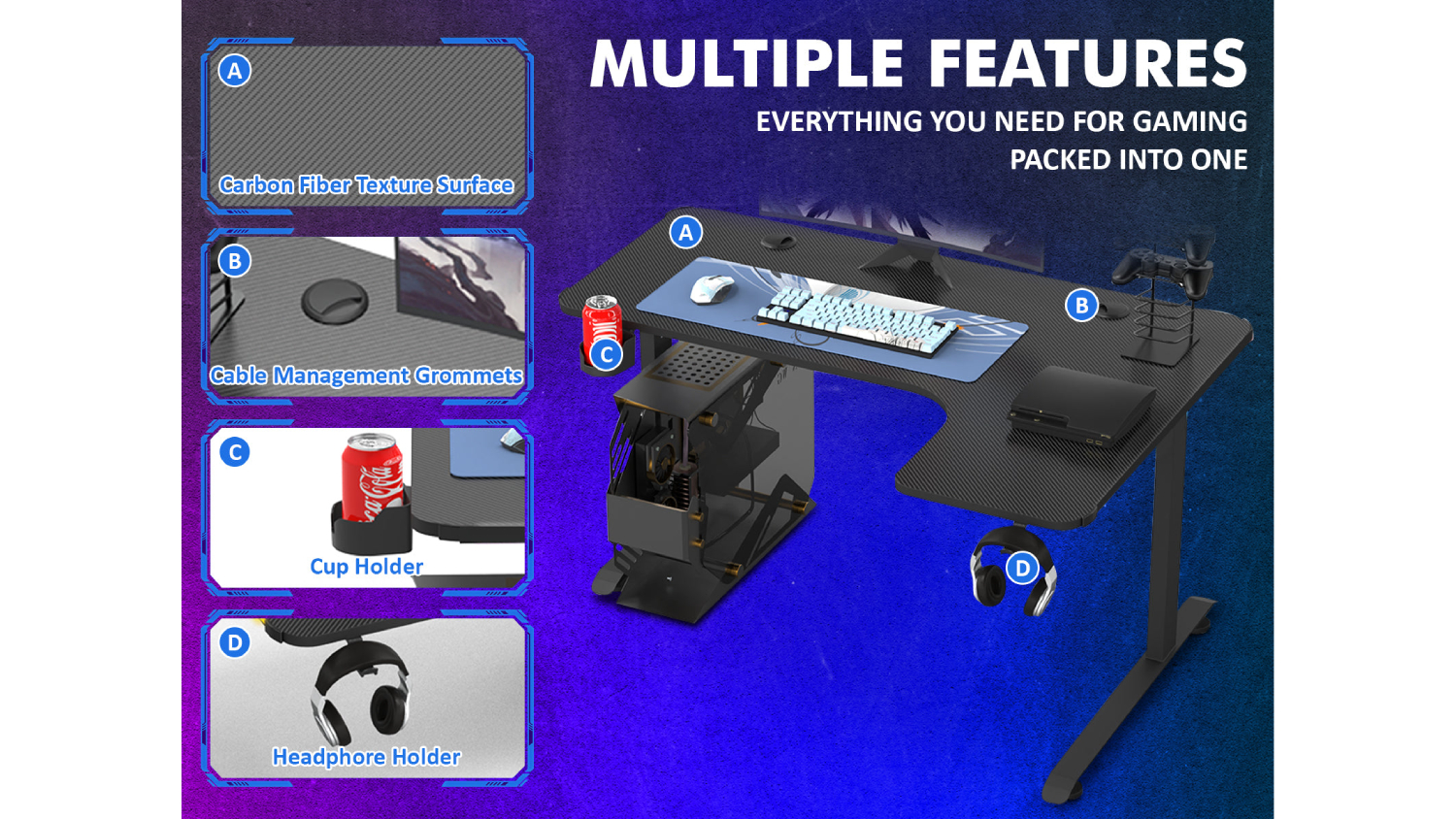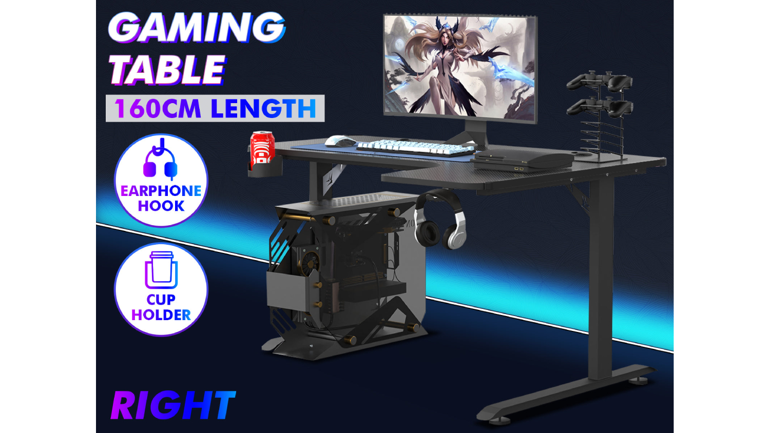 Level up your entertainment setup with the TSB Living Right-Handed L-Shaped Gaming Desk with Cup Holder and PC Tower Mount! This sturdy furniture features a spacious design and a stylish carbon fibre textured top. You can also stay organised with the headphone hook and cup holder. Whether you're playing, working, or studying, this desk is the perfect companion!