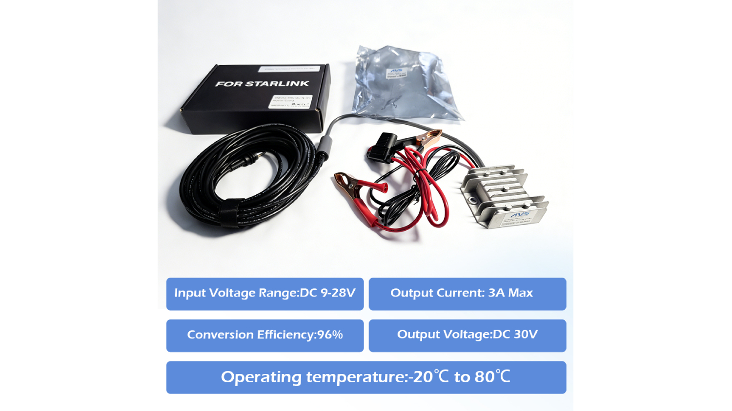 Meet the Air Vision Systems Starlink Mini Step-Up Converter with Alligator Clips—a compact, reliable solution that boosts 12V or 24V DC battery power up to 30V. Built with a durable aluminium housing, this 90W converter delivers stable output through its female DC plug, making it perfect for off‑grid setups, vehicles, boats or portable battery banks. With included alligator clip leads, it’s designed for quick, secure connections.