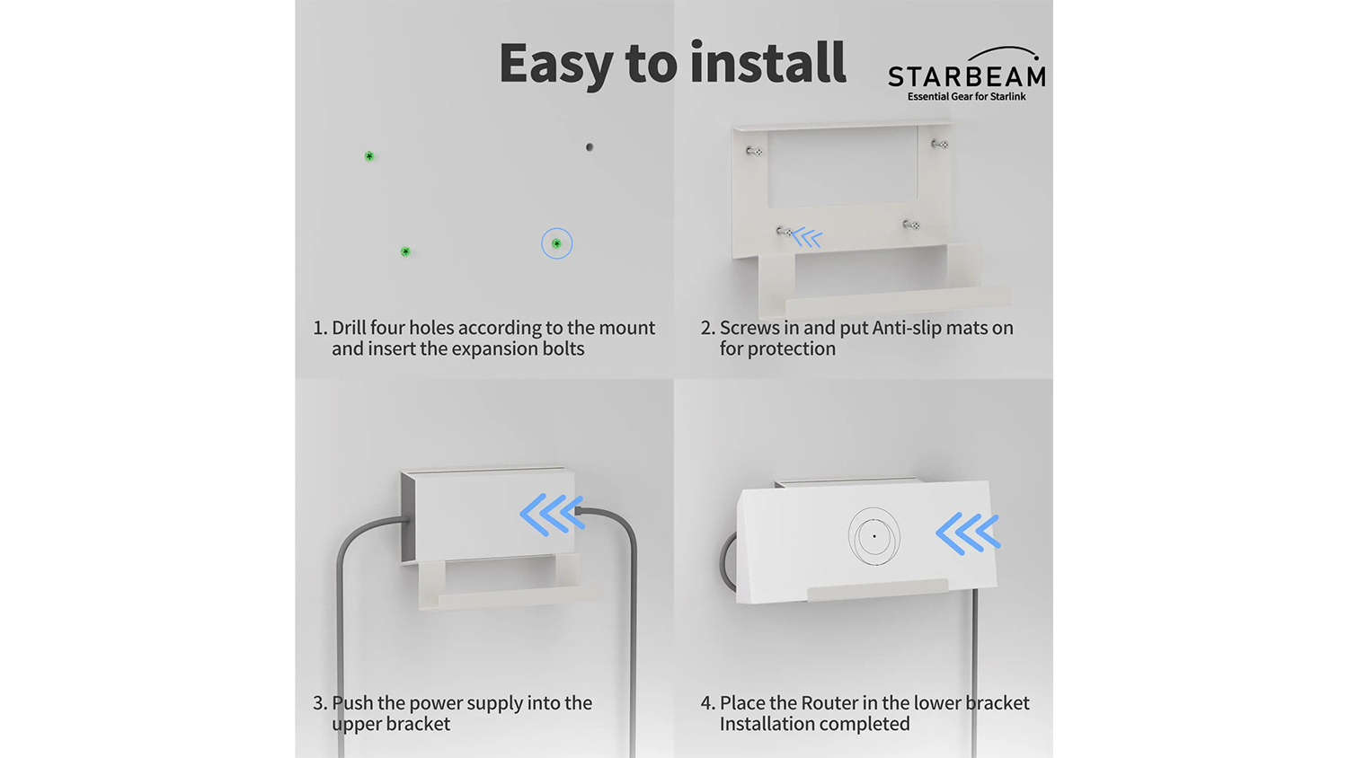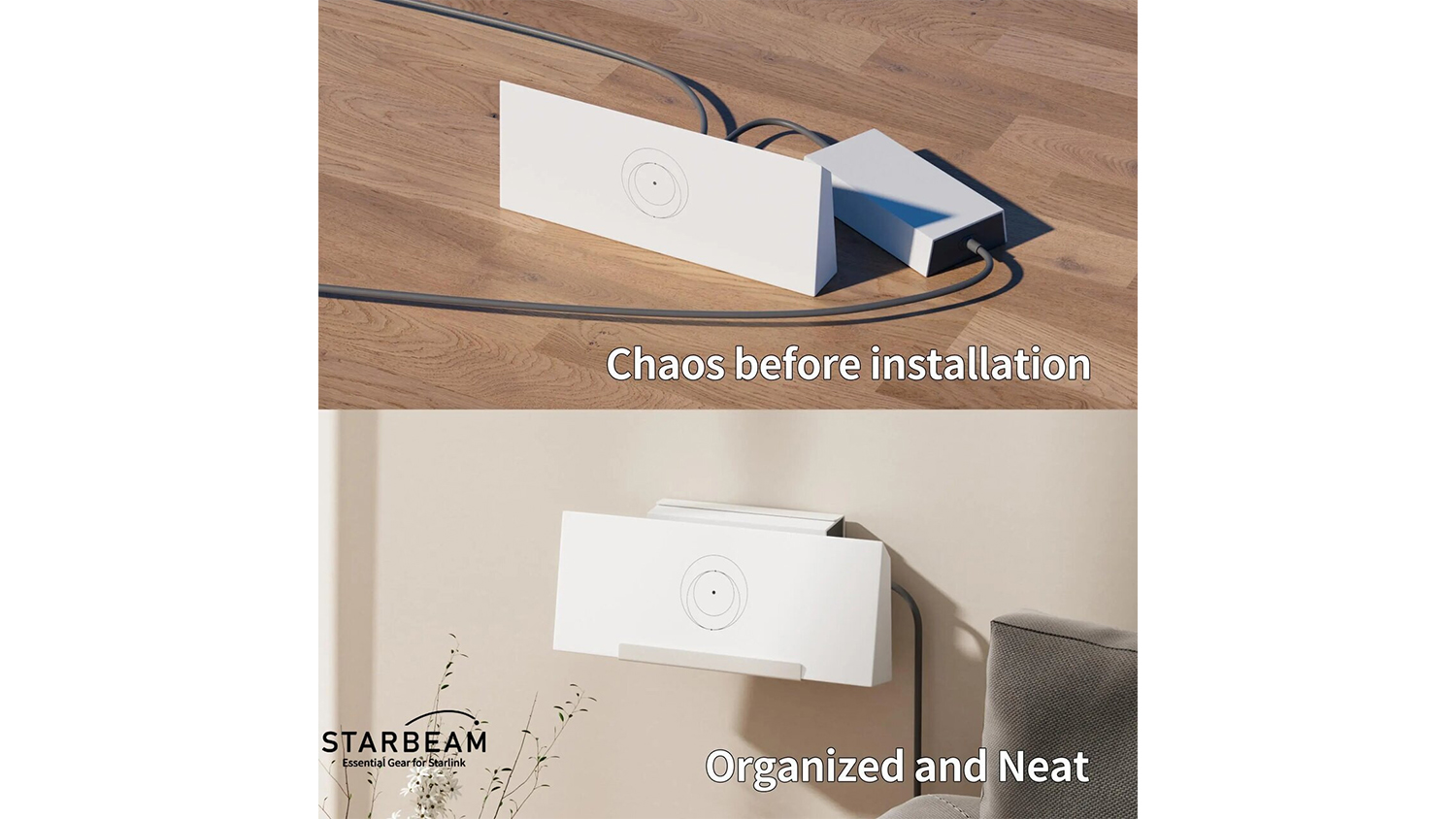 Streamline your Starlink setup with the Starbeam Router & Power Kit for Starlink Gen 3! This smart wall mount unites your Starlink router and power supply into one compact, space-saving unit for a tidy, clutter-free environment. It’s designed with a gravity-centred structure for stability and crafted from durable ferroalloy with a rust-resistant finish.