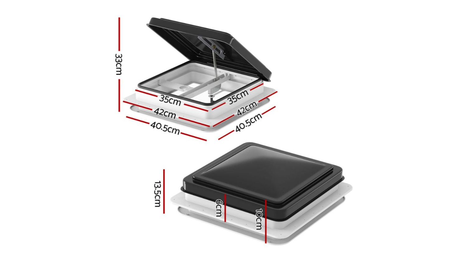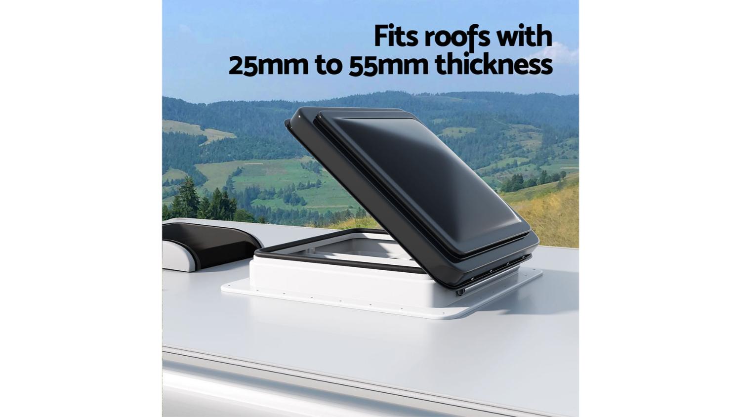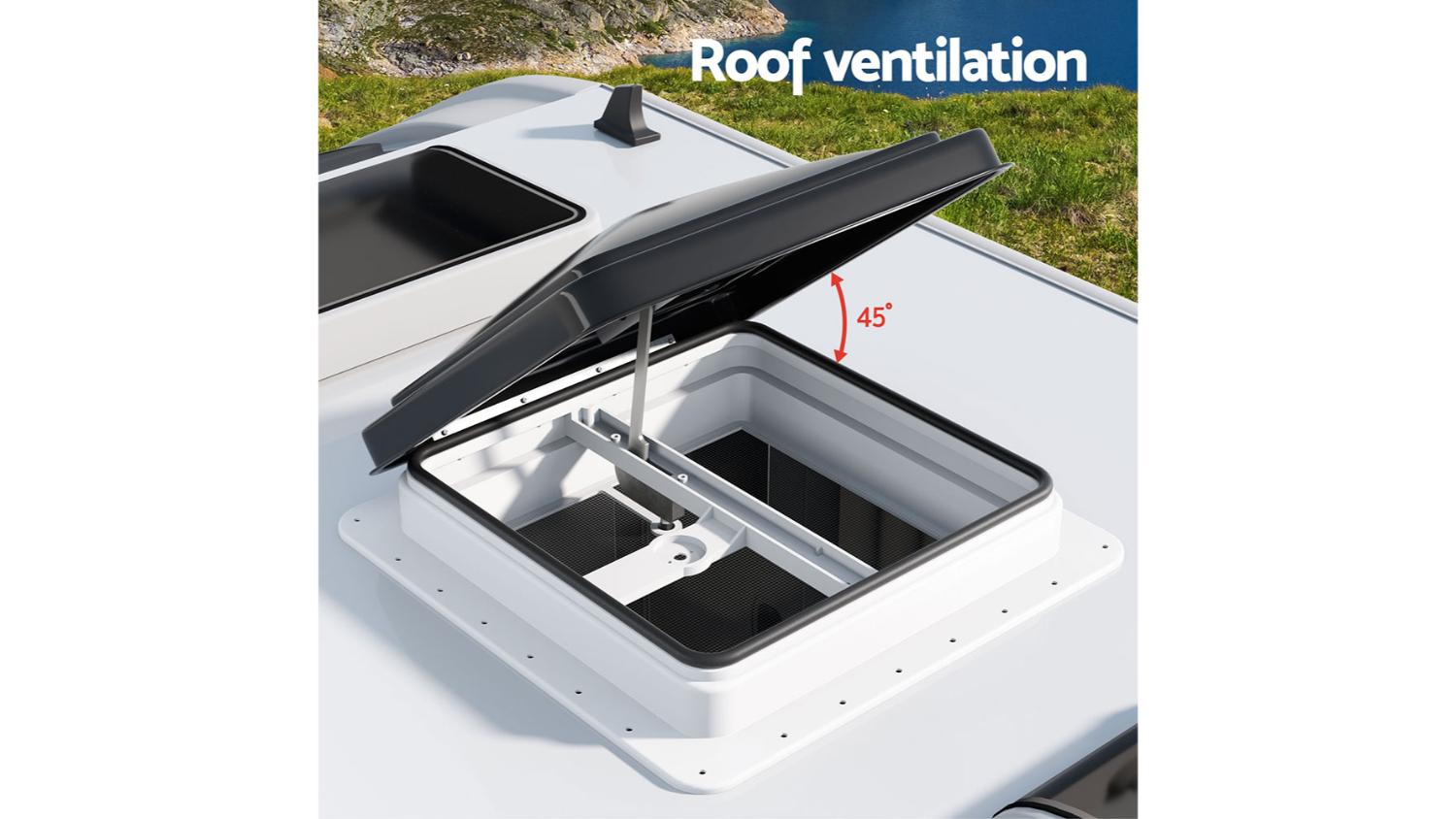 Enjoy fresh air with the Giantz Adjustable Caravan Roof Ventilation Hatch with Mesh Guard 40.5 x 40.5 x 13.5cm! With its 45° wide-angle opening, it allows for efficient airflow, ensuring a comfortable and refreshing environment inside. Whether it's summer or winter, this vent is suitable for use in all seasons and weather conditions.