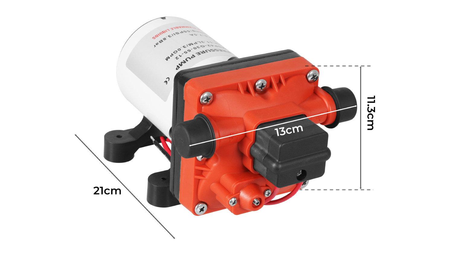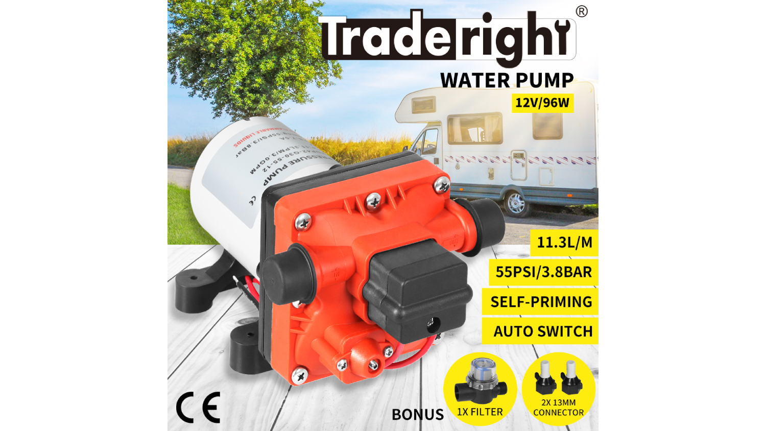 Enjoy the convenience of running water on your next adventure with the Traderight 12V Caravan Water Pump. This compact and efficient pump delivers a powerful 11.3 litre/min flow for showers, garden sprinklers, and more. It also has a durable 4-chamber diaphragm and a bypass control for longevity, so it's easy to install and operates quietly.