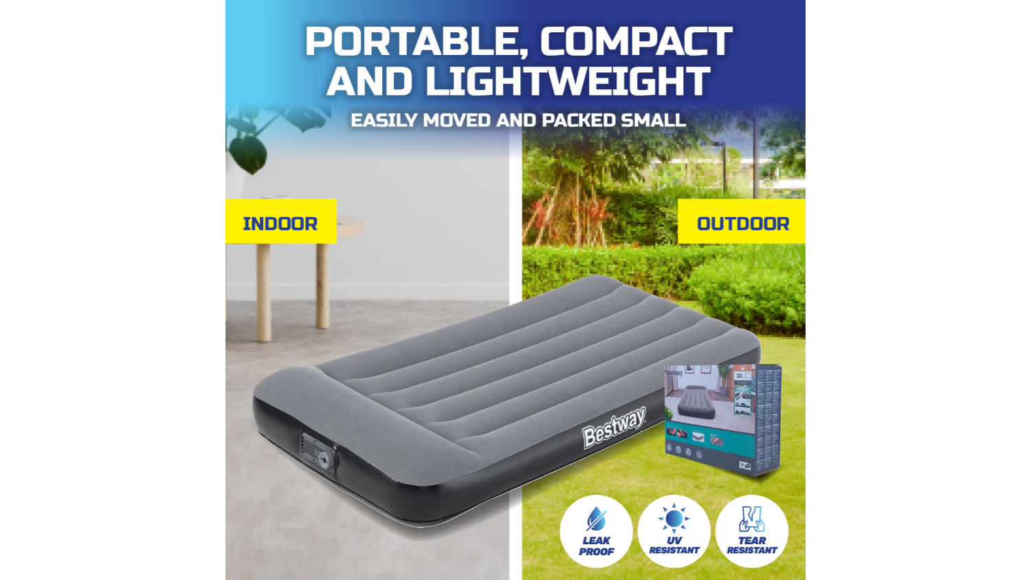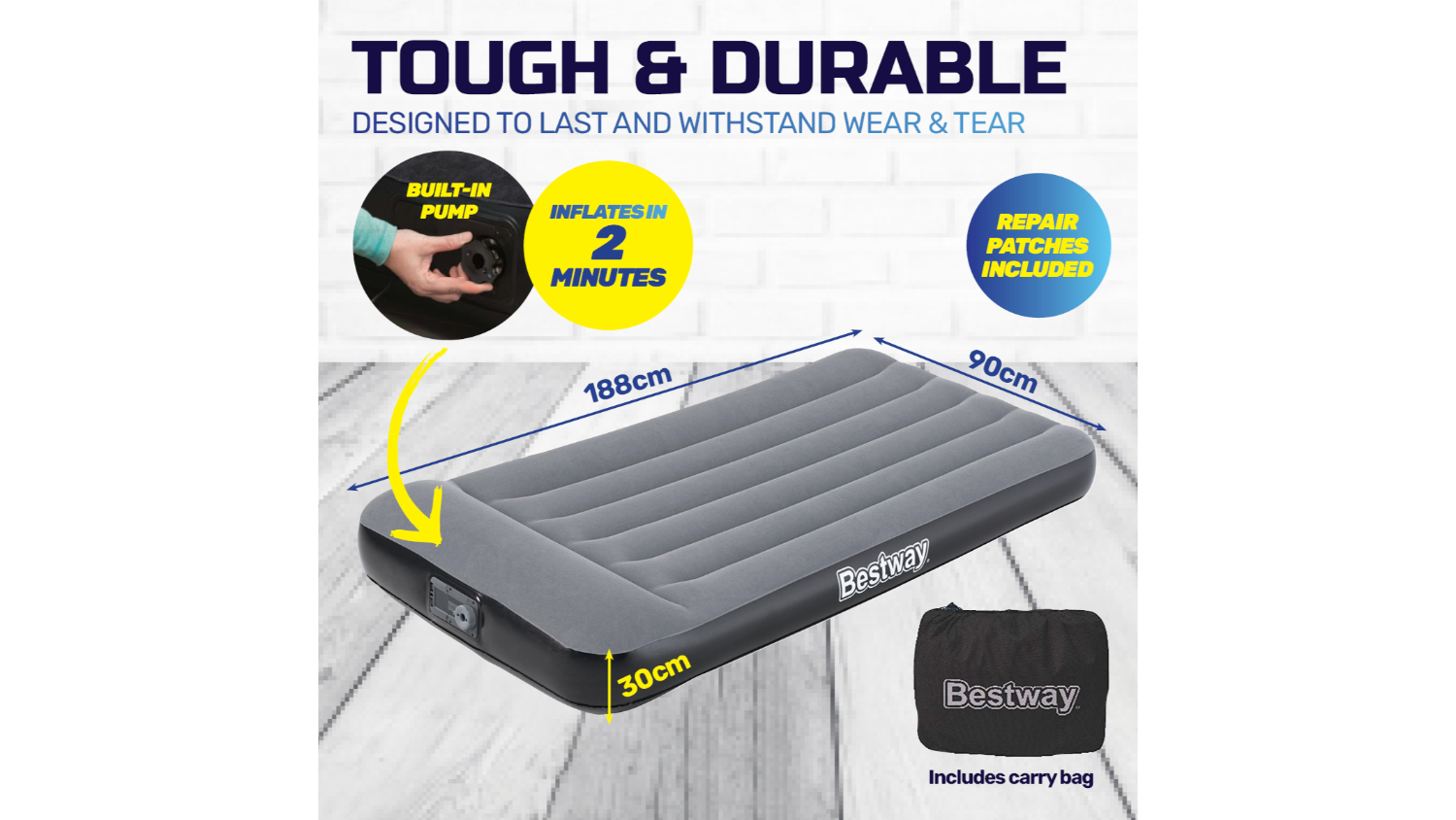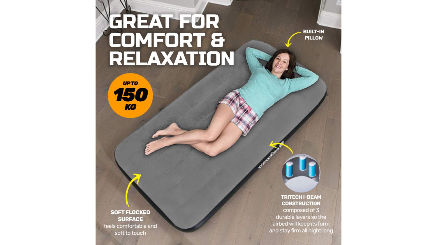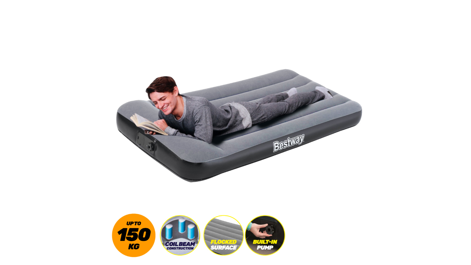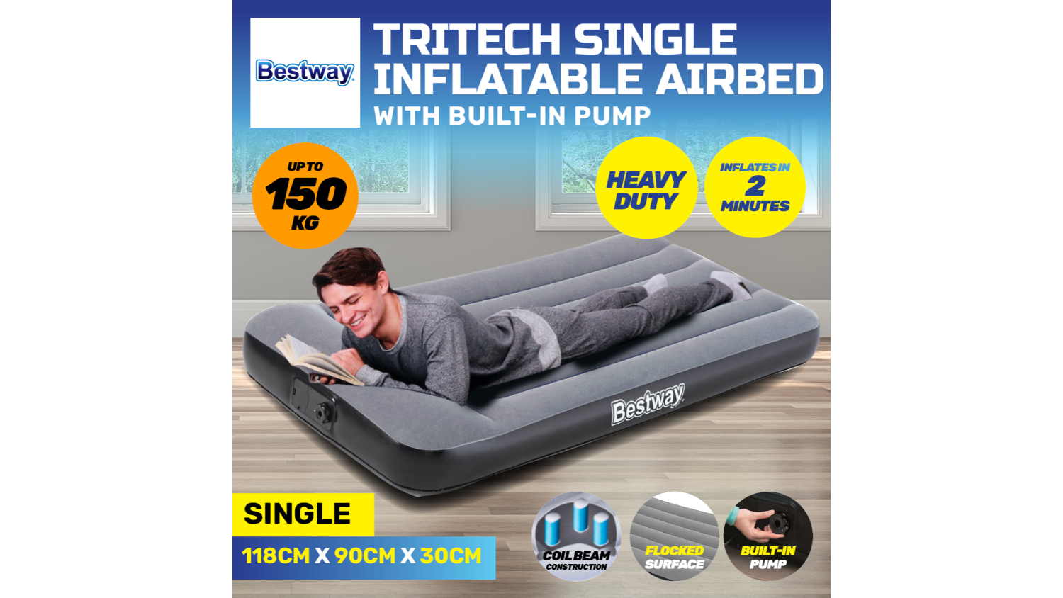 Experience the luxury of a comfortable bed anytime, anywhere with the Tritech Single Inflatable Airbed! It features a spacious 118cm x 99cm x 30cm size and sturdy Tritech construction, offering superior stability and support—ensuring a great night's sleep. No more hassle on looking for a tool to inflate the bed as it comes with a built-in pump. Whether you're camping, travelling, hosting guests, or need an extra bed for your loved ones, this airbed has got you covered.