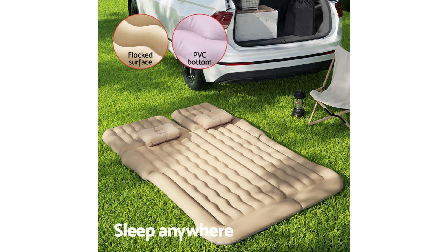 Transform your vehicle into a cosy resting spot with the Weisshorn Inflatable Car Mattress 175 x 130cm. This comfy mattress is made with high-quality materials, making it both plush and supportive. The flocked surface is super comfy, and the non-slip bottom keeps it in place. It even comes with 2 pillows and an air pump for a quick and easy setup. When deflated, it folds compactly and stores in the included carry bag. Perfect for car camping, road trips, or even a comfy spot for unexpected guests!