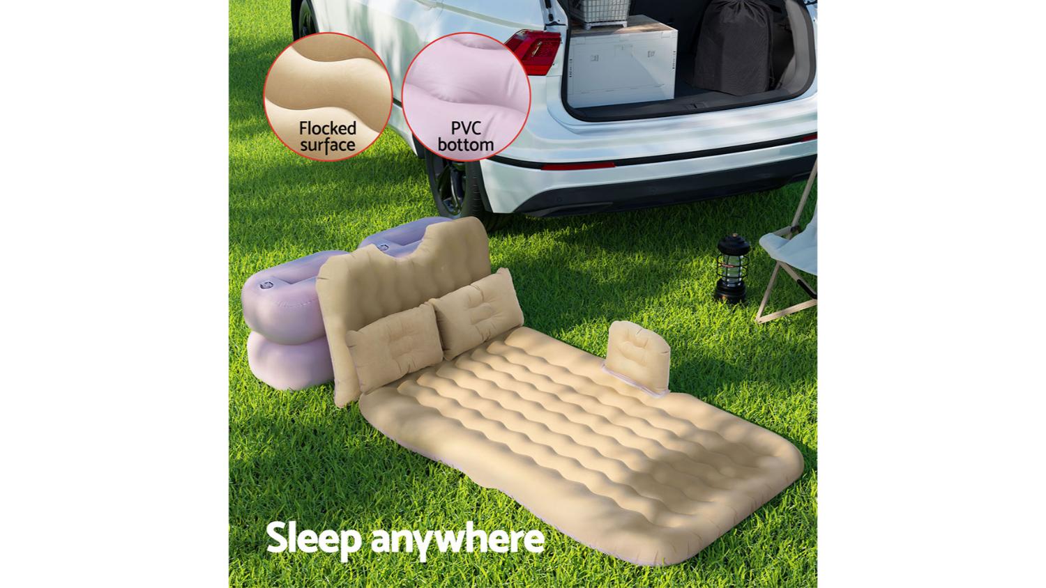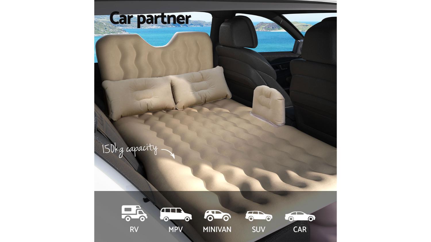 Transform your vehicle into a cosy resting spot with the Weisshorn Inflatable Car Mattress 176 x 80cm. This comfy mattress is made with high-quality materials, making it both plush and supportive. The flocked surface is super comfy, and the non-slip bottom keeps it in place. It even comes with 2 pillows and an air pump for a quick and easy setup. When deflated, it folds compactly and stores in the included carry bag. Perfect for car camping, road trips, or even a comfy spot for unexpected guests!