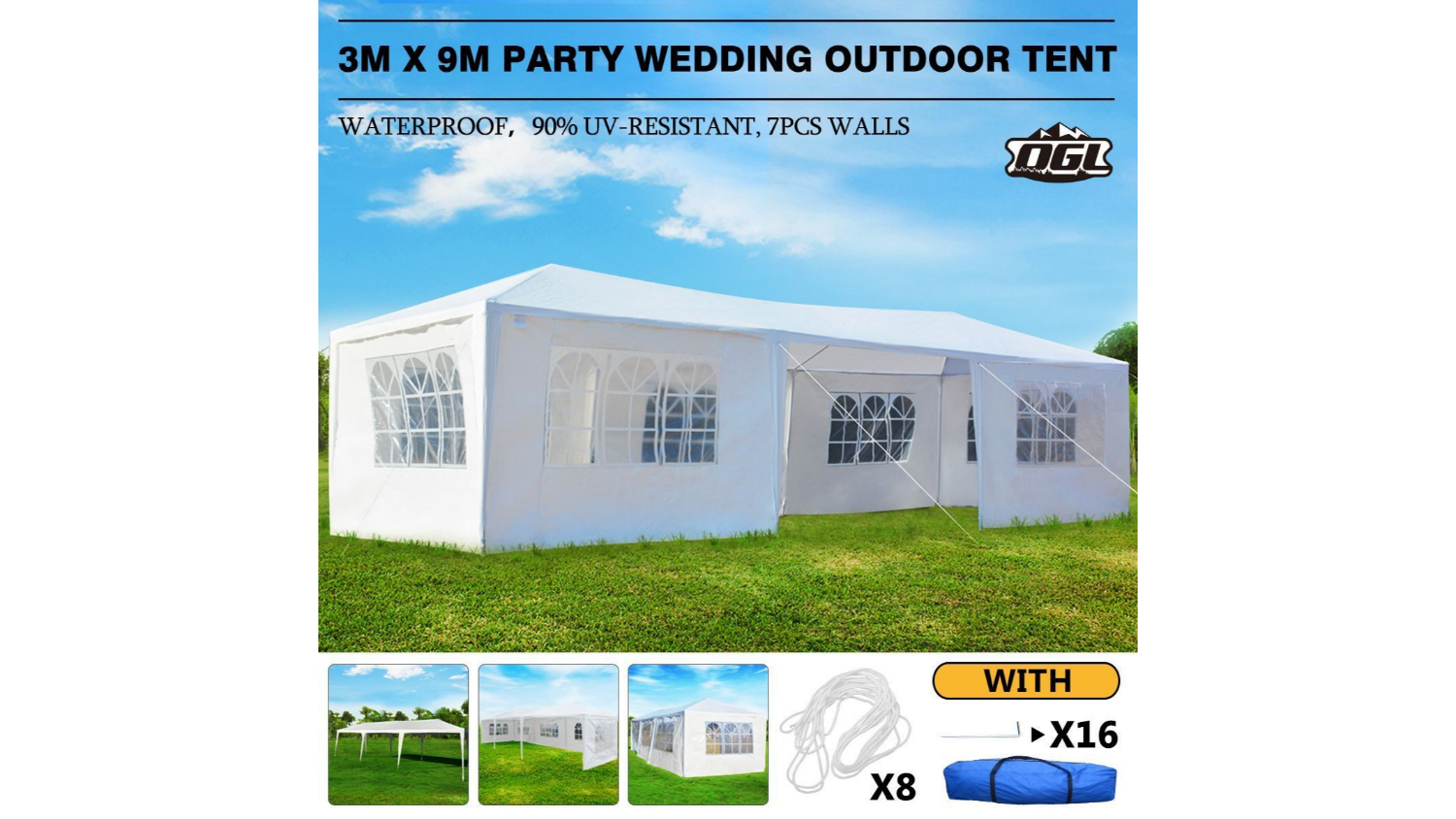 OGL Outdoor Gazebo Tent 3 x 9m with Carry Case, Walls 7pcs. - White