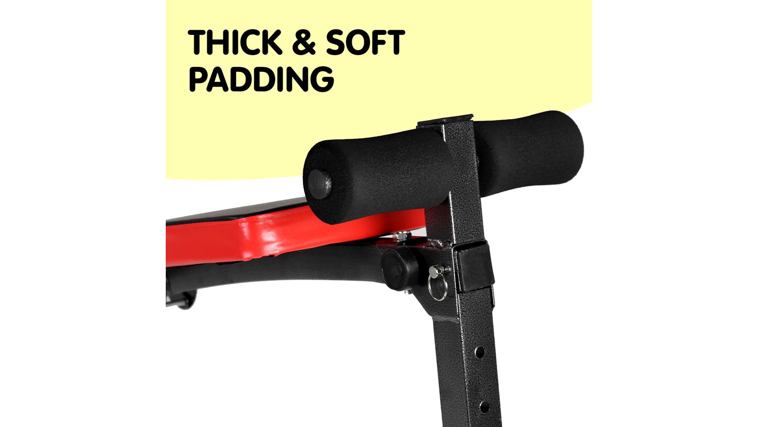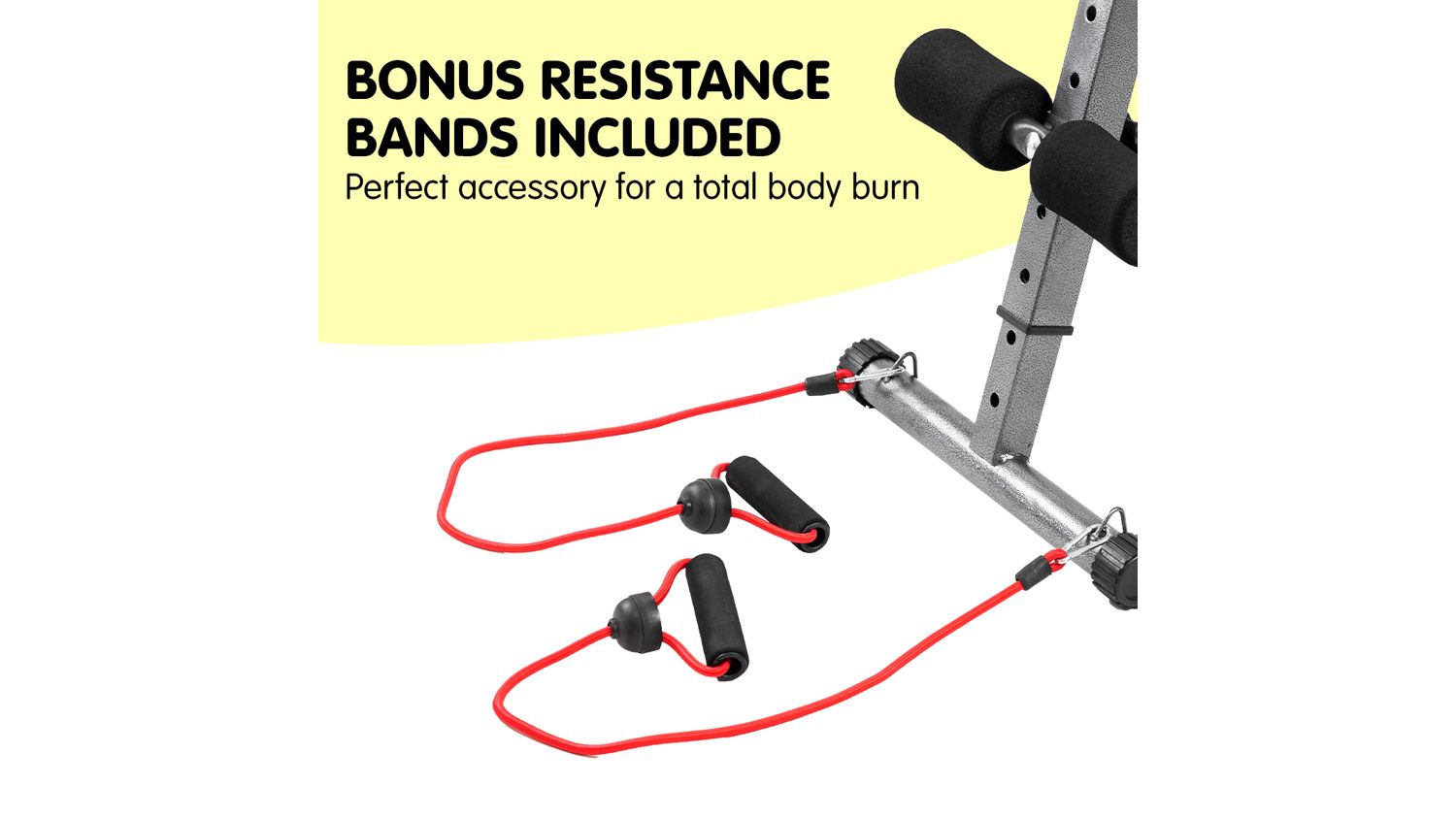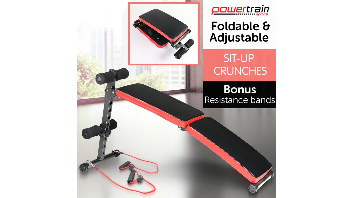 Level up your workout sessions with the Powertrain Incline Sit-Up Gym Bench with Bands! A great addition to your home gym, this innovative steel incline sit-up bench improves your core strength with sit-ups, twists, and abdominal exercises. Plus, this equipment includes nifty resistance bands to help tone your biceps and triceps.