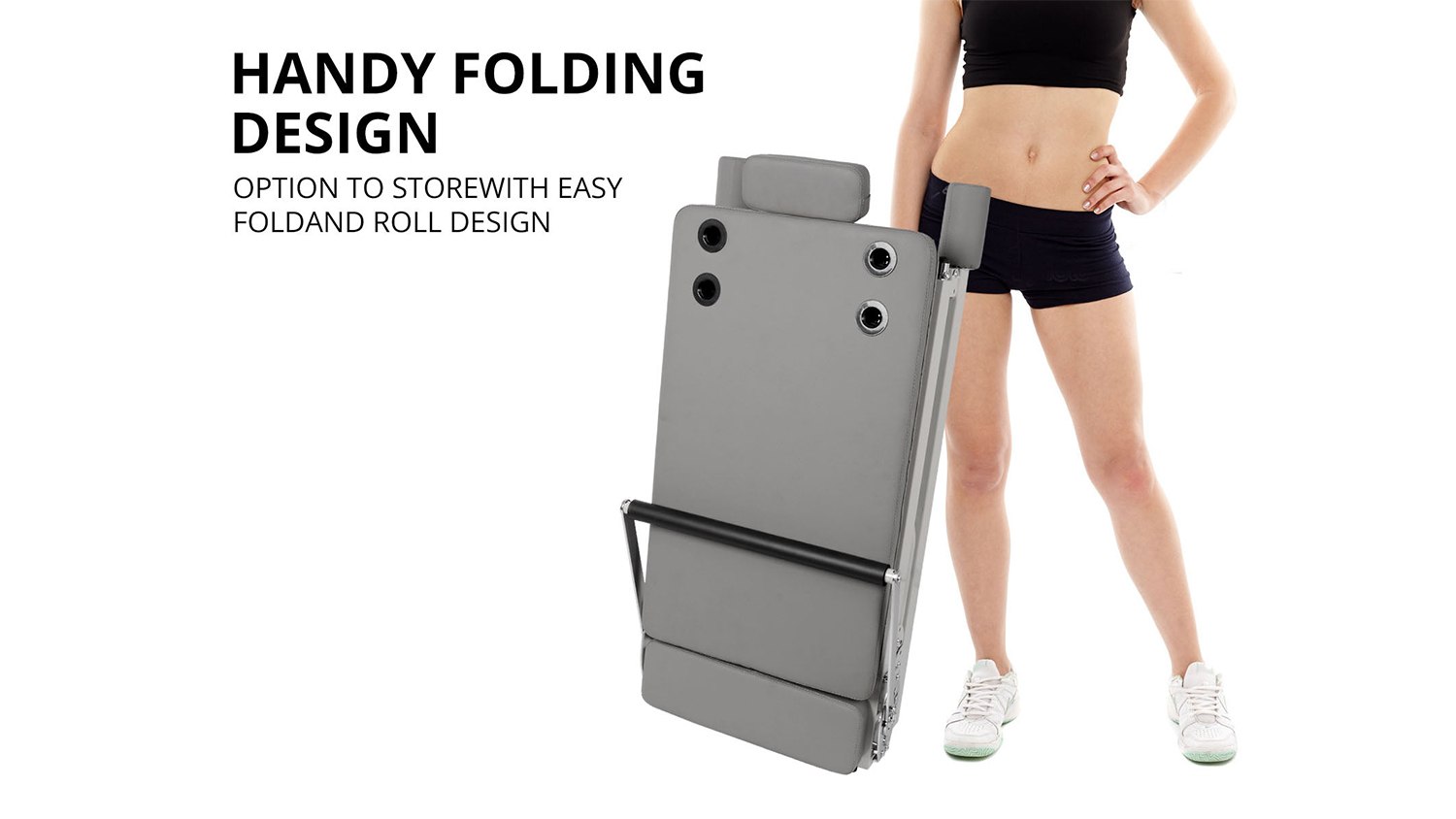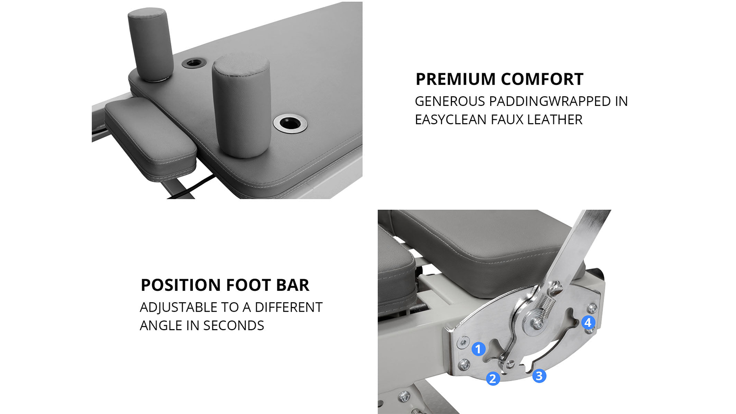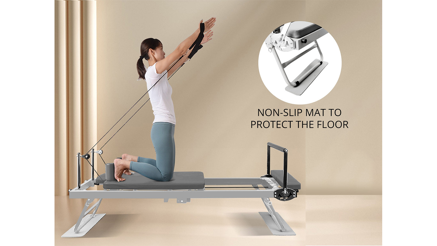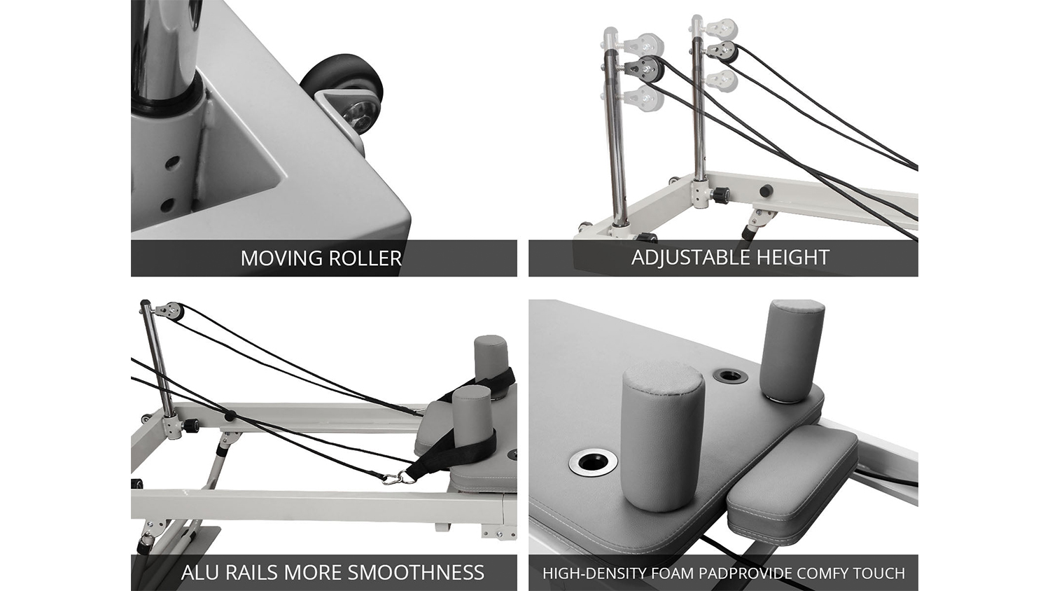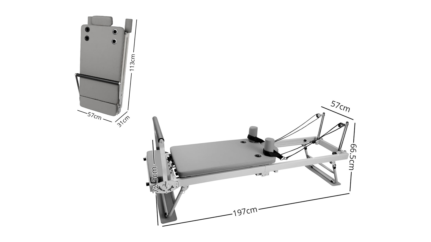 Level up your everyday training at home using the PROTRAIN Reformer Pilates Device with Headrest. A perfect solution for full-body workouts, this unit helps strengthen, lengthen, and tone your body. It also delivers superb flexibility, featuring an adjustable pulley bar, foot bar, and five tension cords to accommodate different fitness levels. Plus, it boasts a comfy and sturdy build for a pro-grade experience.